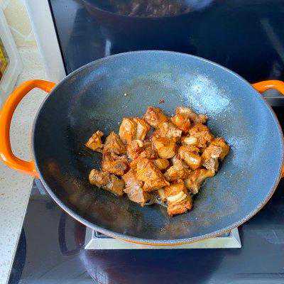 5、锅里放入植物油,放入冰糖粒,中小火加热,慢慢搅拌至冰糖融化成焦黄色,这就是常说的炒糖色。