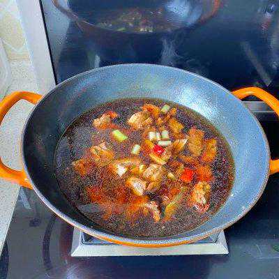 8、加入适量热水,热水的用量最少也要没过排骨块,喜欢汤汁的多加点,喜欢吃菜的少加点水。