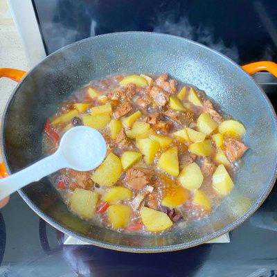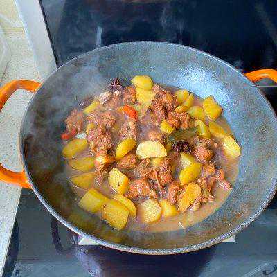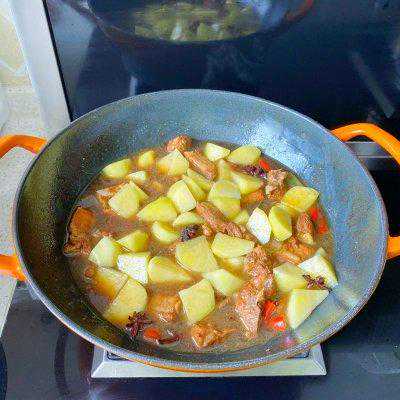 10、25分钟后,排骨已经熟透了,把土豆块倒入锅里,翻拌均匀后盖上盖子,再炖八九分钟,把土豆炖熟就可以了。