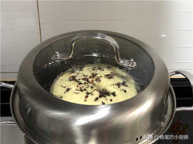 3、一定要记得盖上一层保鲜膜,以防在蒸过程入太多水汽,会影响到面糊的长高。