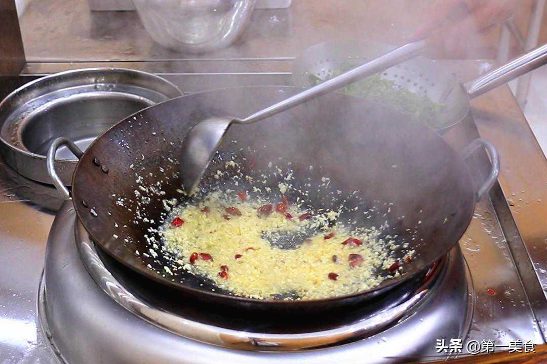 6.锅内多烧一点油,油温五成热时倒入蒜末和干辣椒一起翻炒,炒出蒜香味。