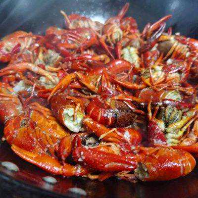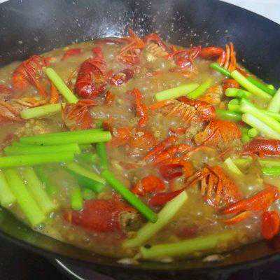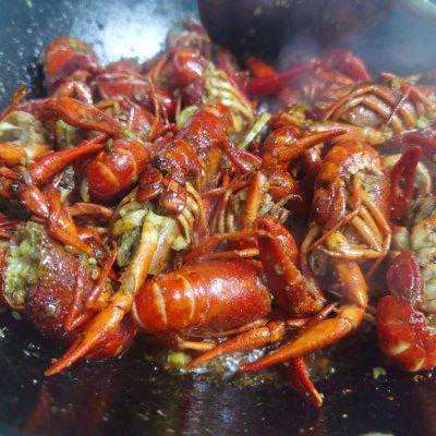 7、将炒好的龙虾倒入锅里,翻炒均匀,加入适量食盐、生抽、料酒、食醋、酱油。