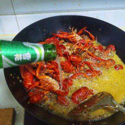 8、加入调料后翻炒均匀加入啤酒,满满一瓶倒完,大火烧至汤汁变少。