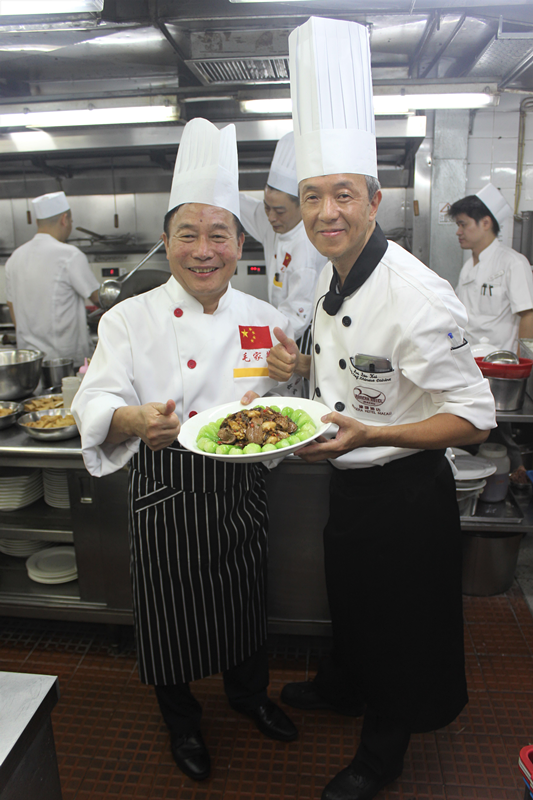 韶山宾馆副总经理徐大斌(左)与澳门濠璟酒店行政总厨吕兆琪(右)交流厨艺