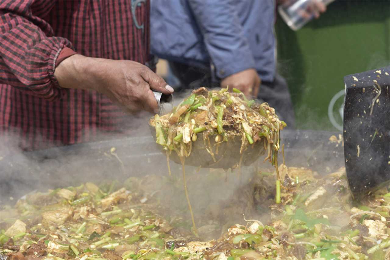 翻菜是个体力活,锅里的菜有一百多斤,这位厨师已经六七十岁了,干起活来还是浑身使不完的劲儿,他手里的铁锹格外引人注目,不断有游客拿手机过来拍照。