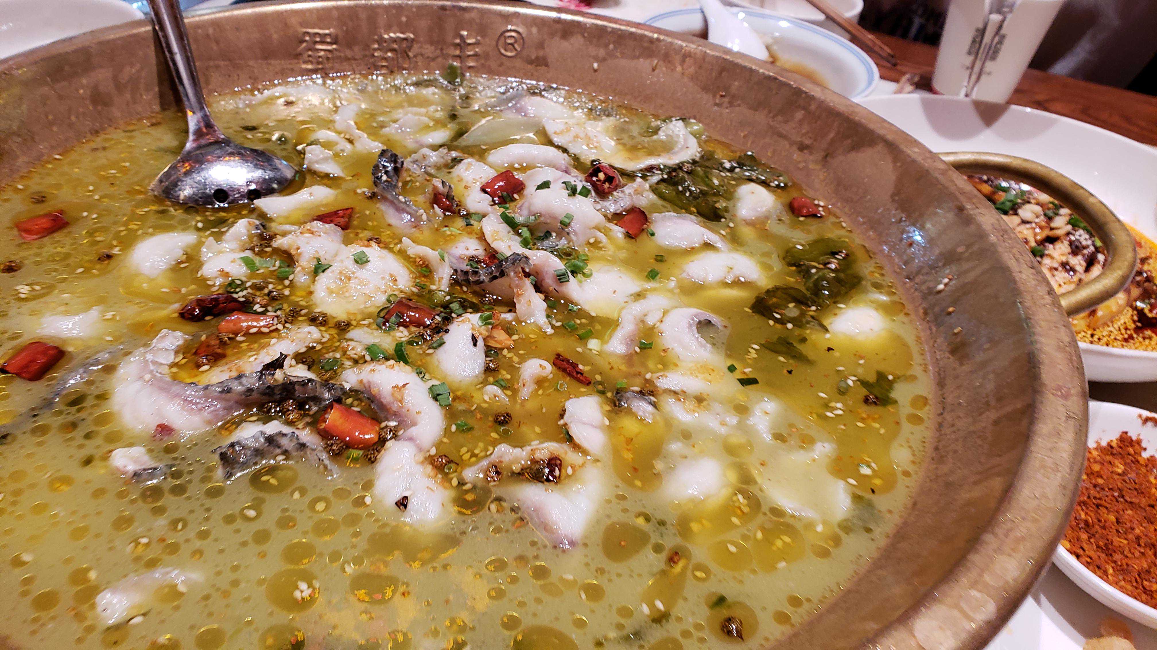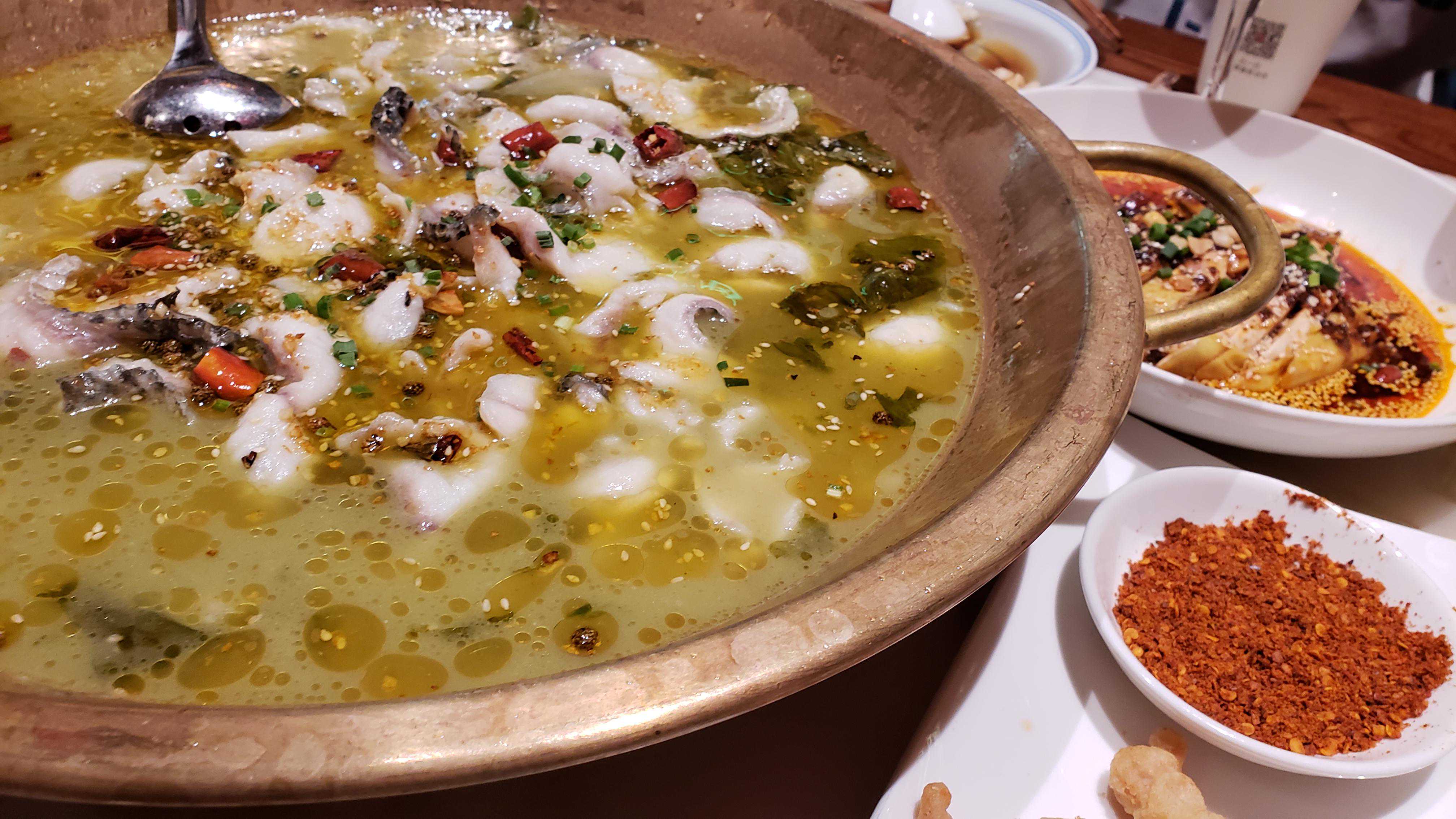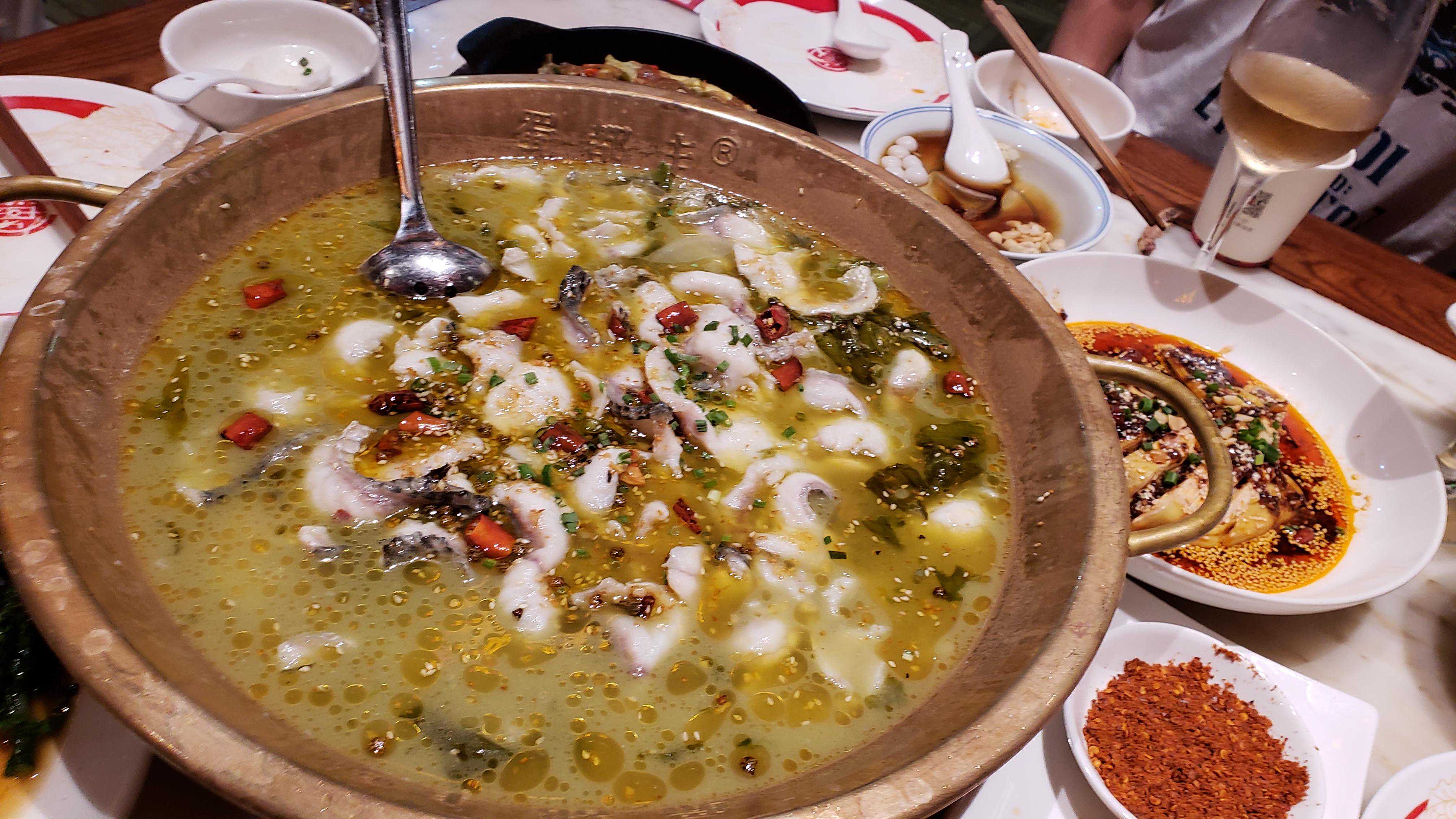 3.5斤的青江鱼盛在一个大铜盆里,金色的汤,雪白的鱼片在酸菜和芝麻的衬托下,油亮亮的让人食欲倍增。