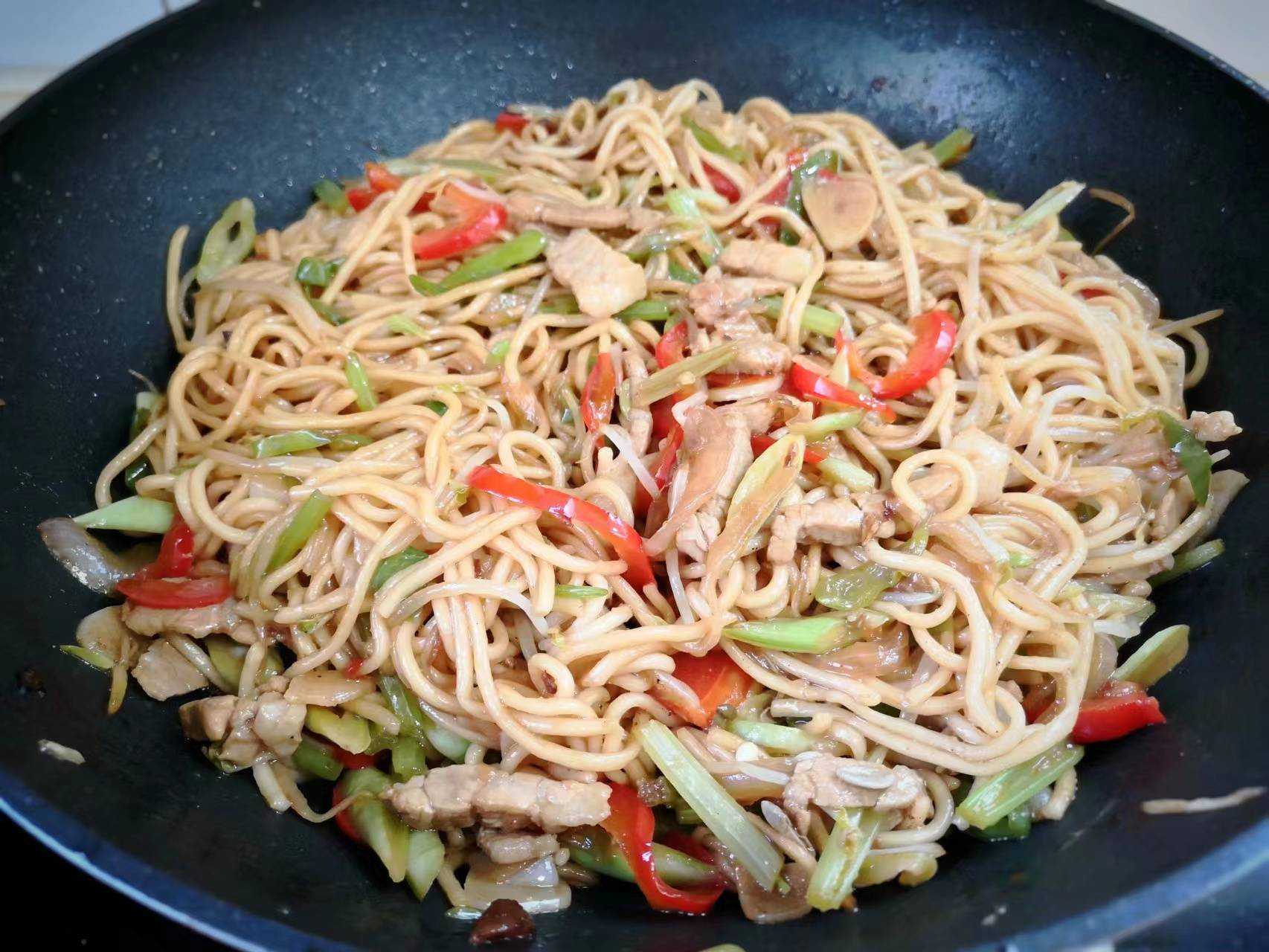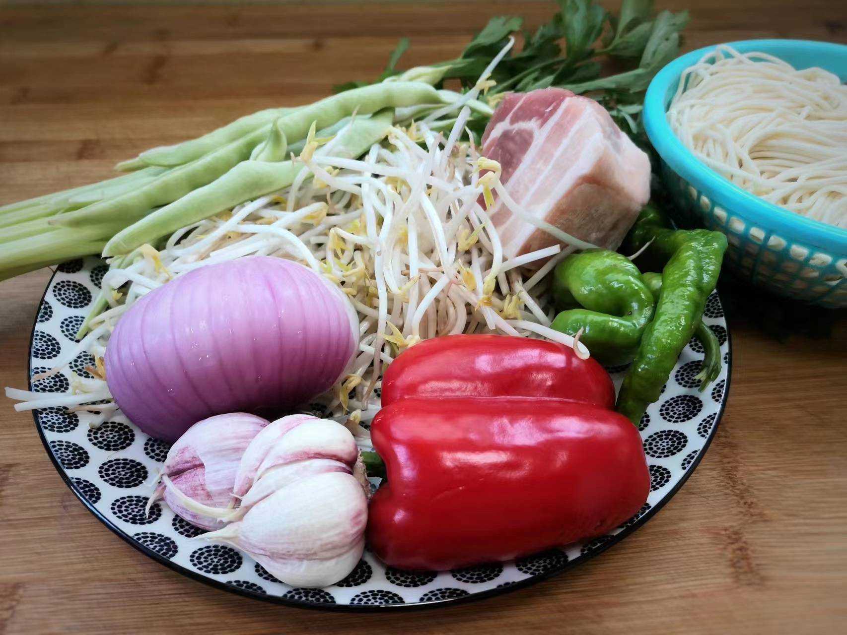 食材:面条、五花肉、芹菜、豆芽、青红椒、豆角、洋葱、大蒜、盐、生抽、蚝油、老抽、鸡精、孜然粉、葱油。