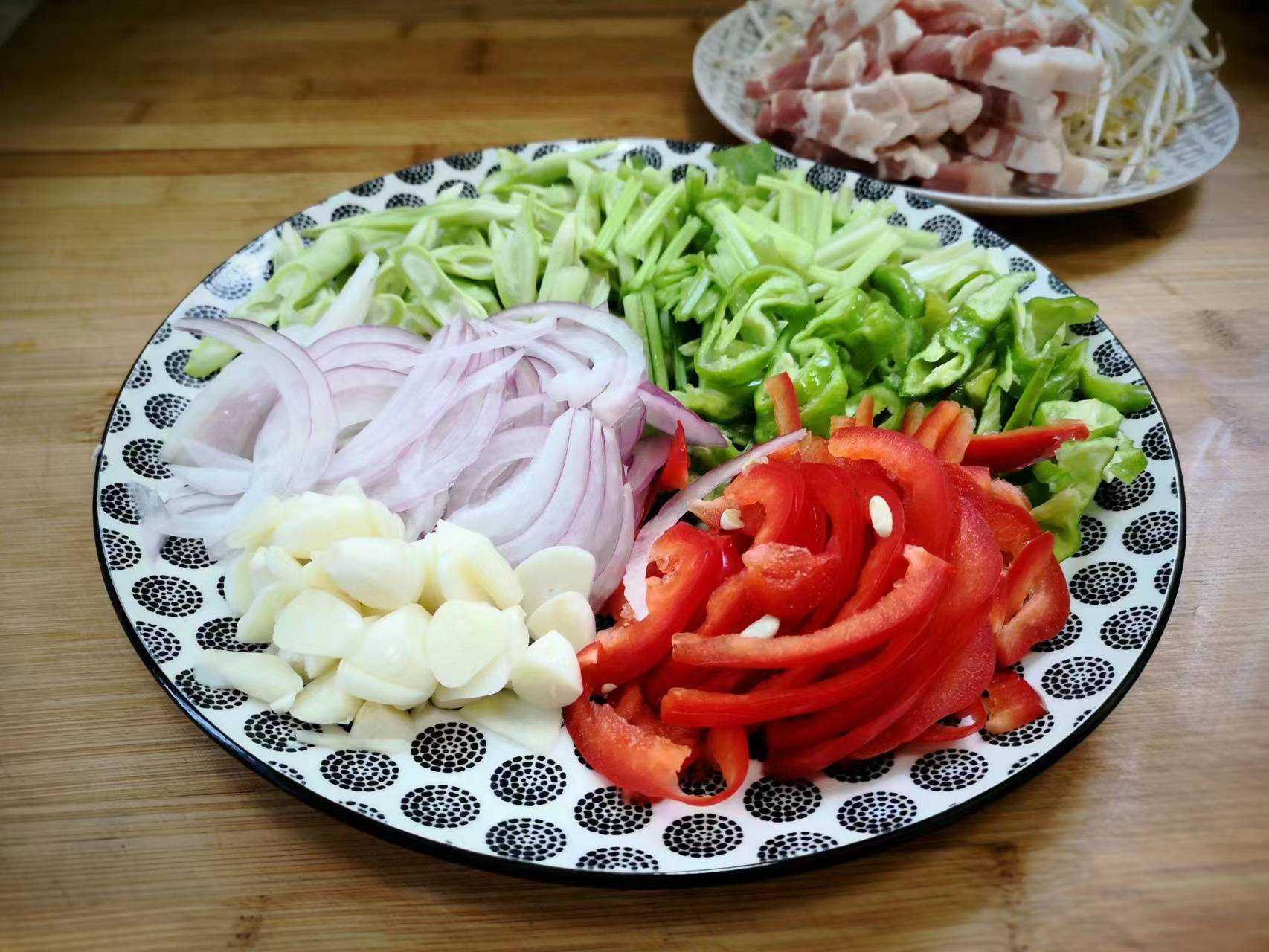 2、蔬菜没有固定的比例,根据的自己口味掌握就行,蔬菜洗净,芹菜切成长段,豆角切成斜刀切成条,青红椒和洋葱切成丝,蒜粒切成片,五花肉切成条。