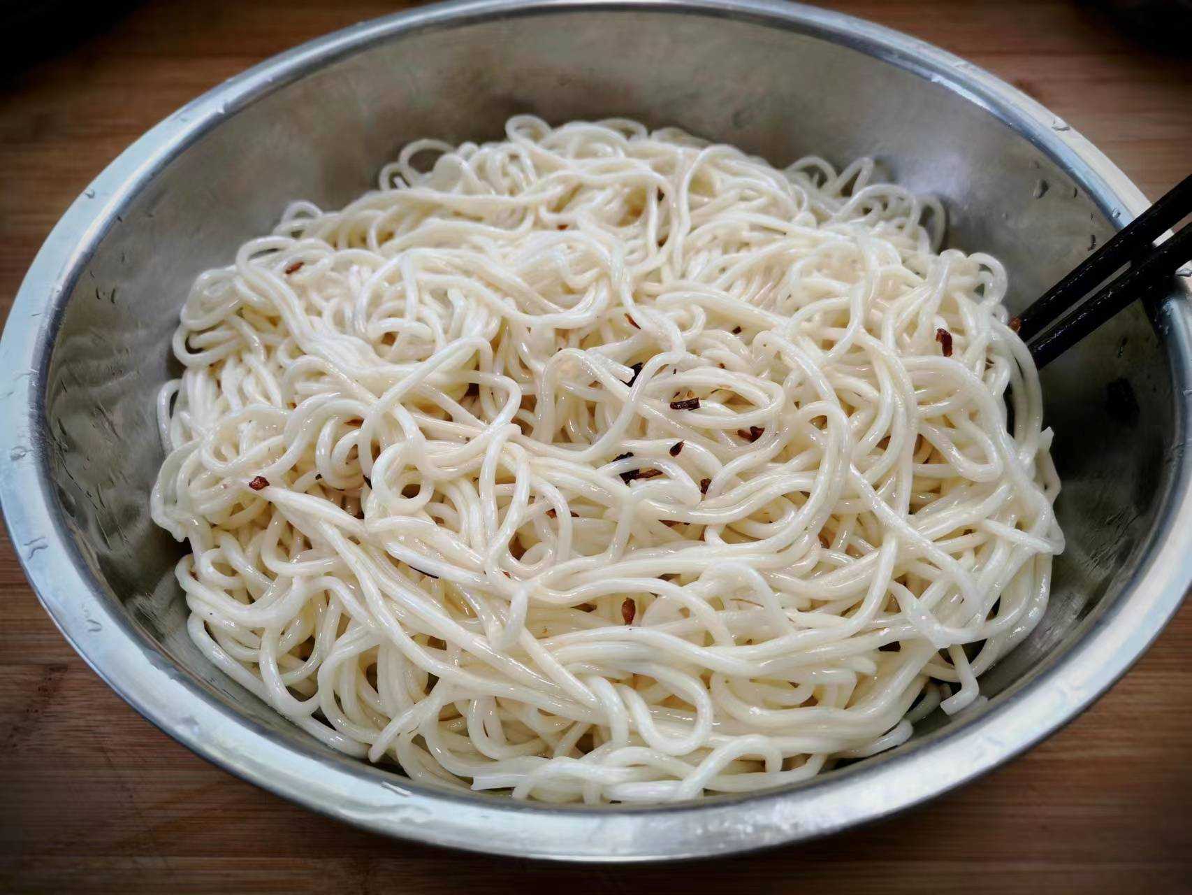 5、加入适量葱油或者食用油,用筷子将面条挑一挑,搅拌均匀,尽量让面条都沾满油脂,放在一边备用。