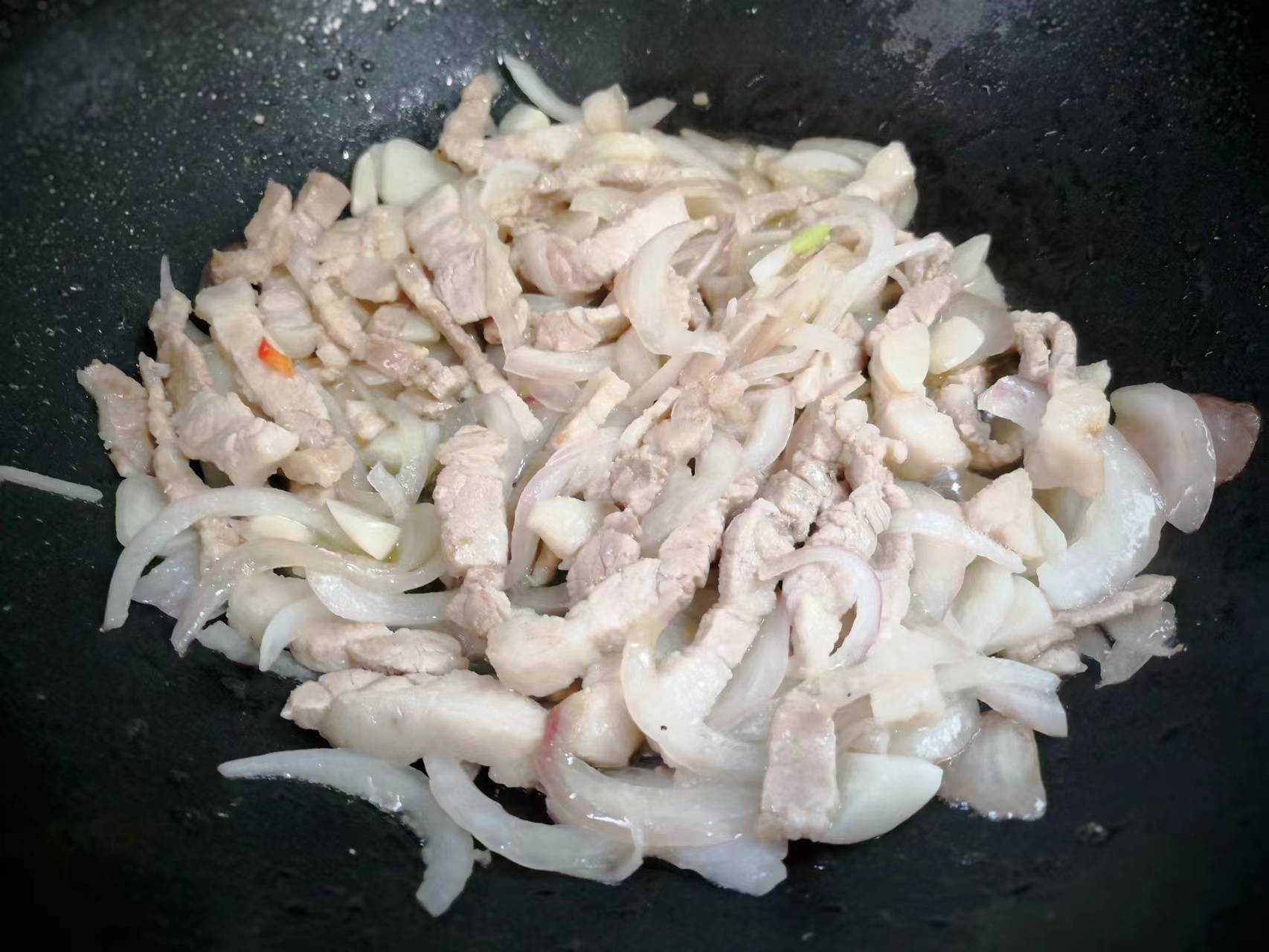 6、炒锅烧热,加入植物油,放入五花肉翻炒出肥肉中油脂,加入洋葱蒜片炒出香味。