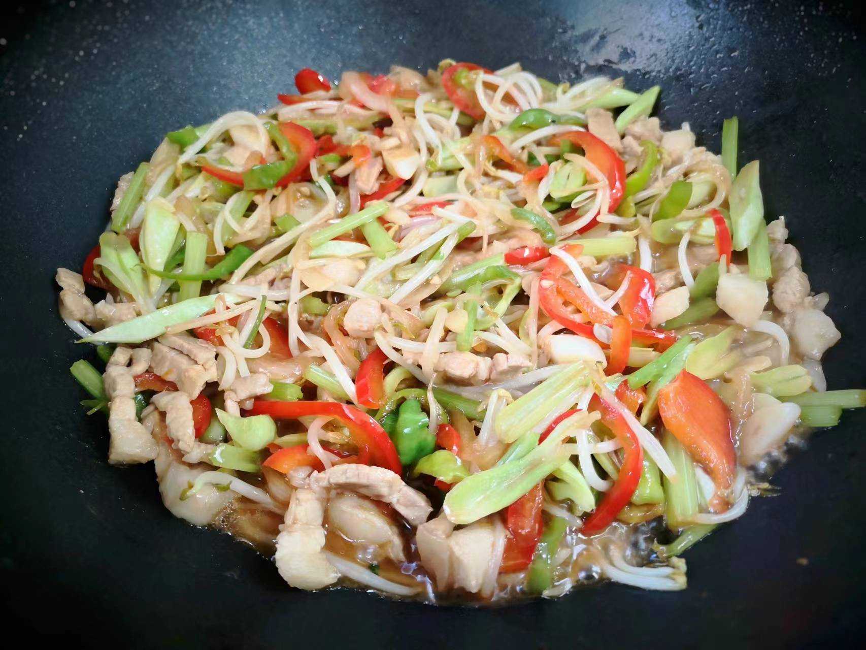 7、加入切好的蔬菜炒上半分钟,然后加入绿豆芽翻炒20秒,加入盐,生抽,蚝油,翻炒断生。