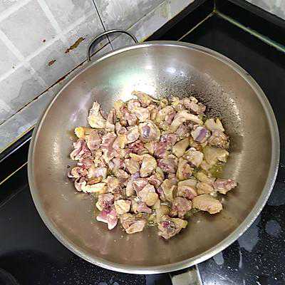 4、放入鸡块、八角…桂皮,辣椒,盐,适量白酒翻炒,中小火慢慢炒至鸡块颜色金黄