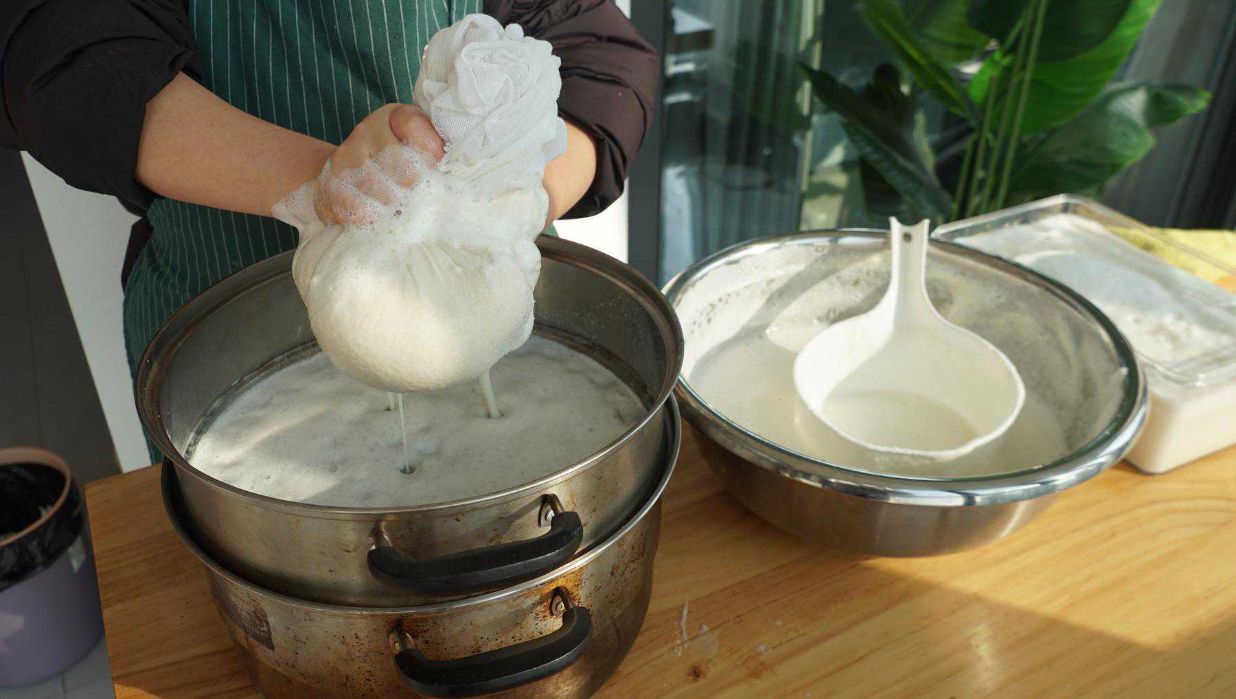 4、打豆浆的时候可以打个两遍,这样出浆率也会更高,我这里一共加了14斤水,全部打好后准备一块纱布。