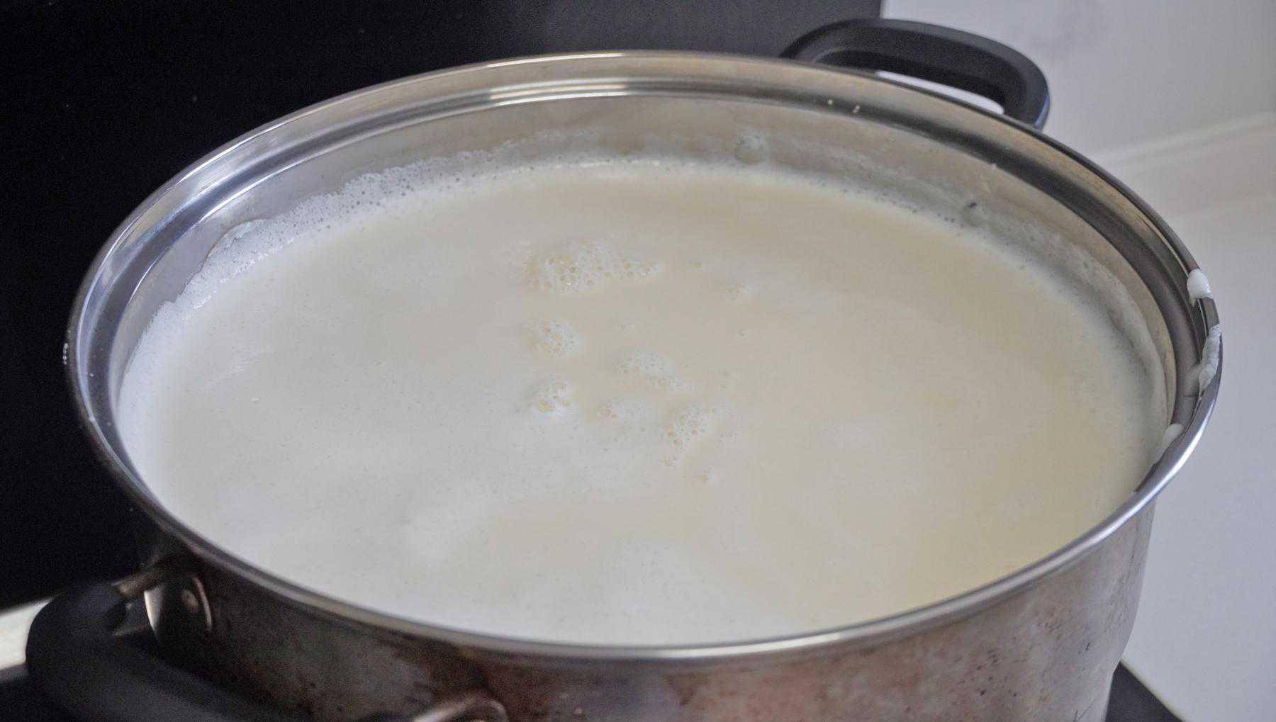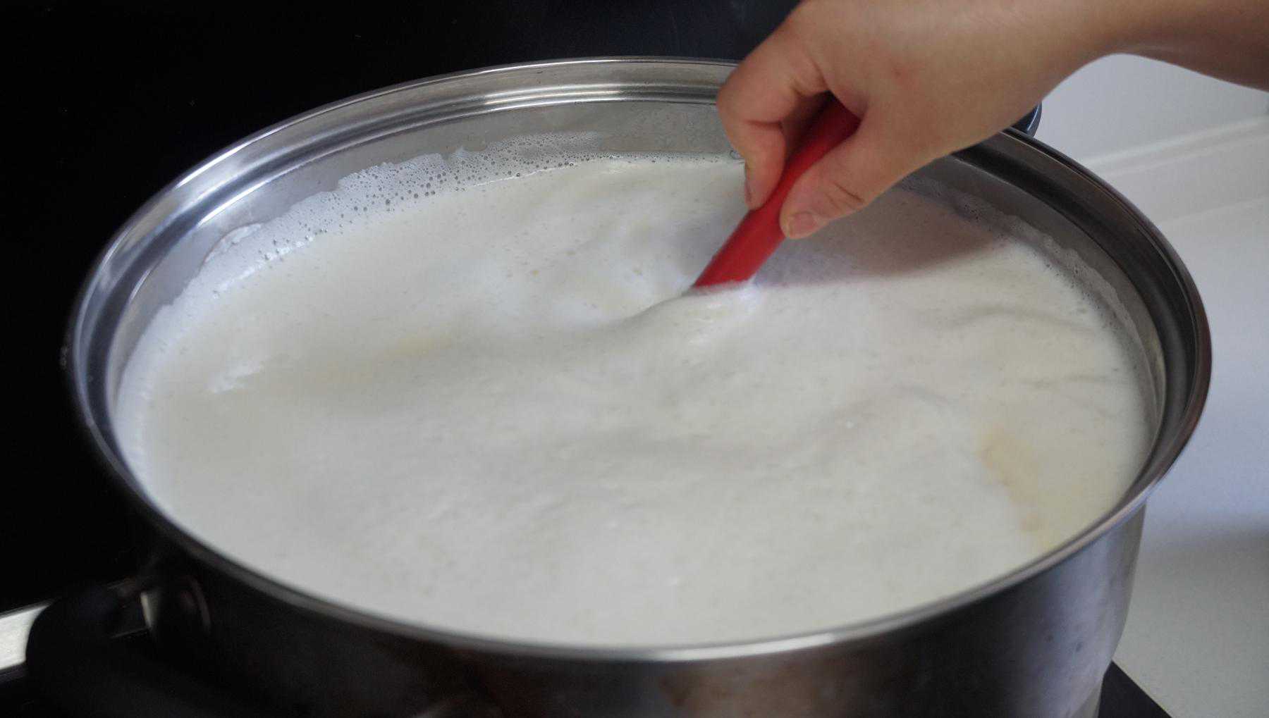 1、豆浆过滤好后就可以开始煮了,边煮边搅拌,浮沫记得打去。豆浆煮开了不要关火,再继续煮个5分钟,把豆浆完全煮沸。