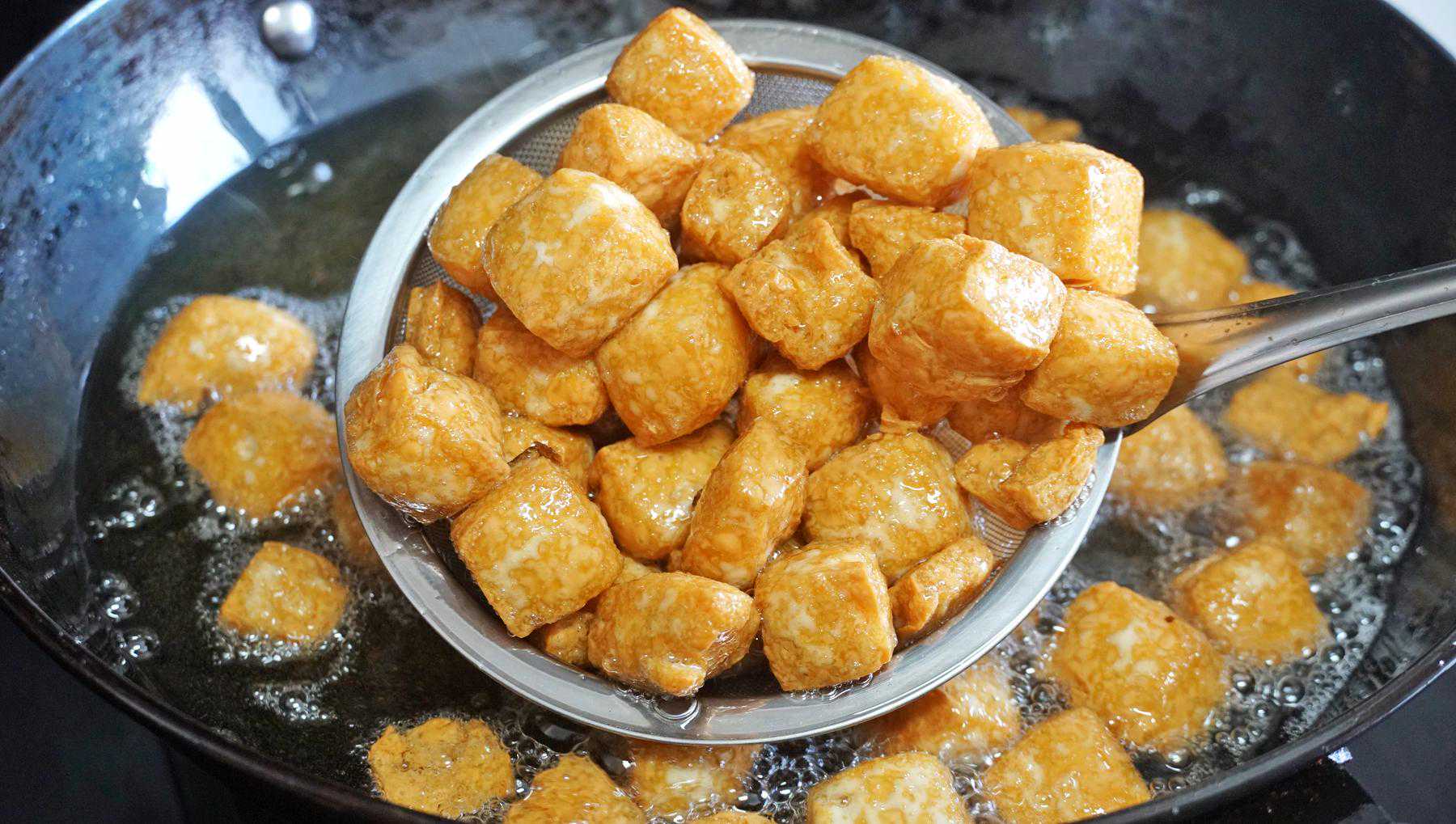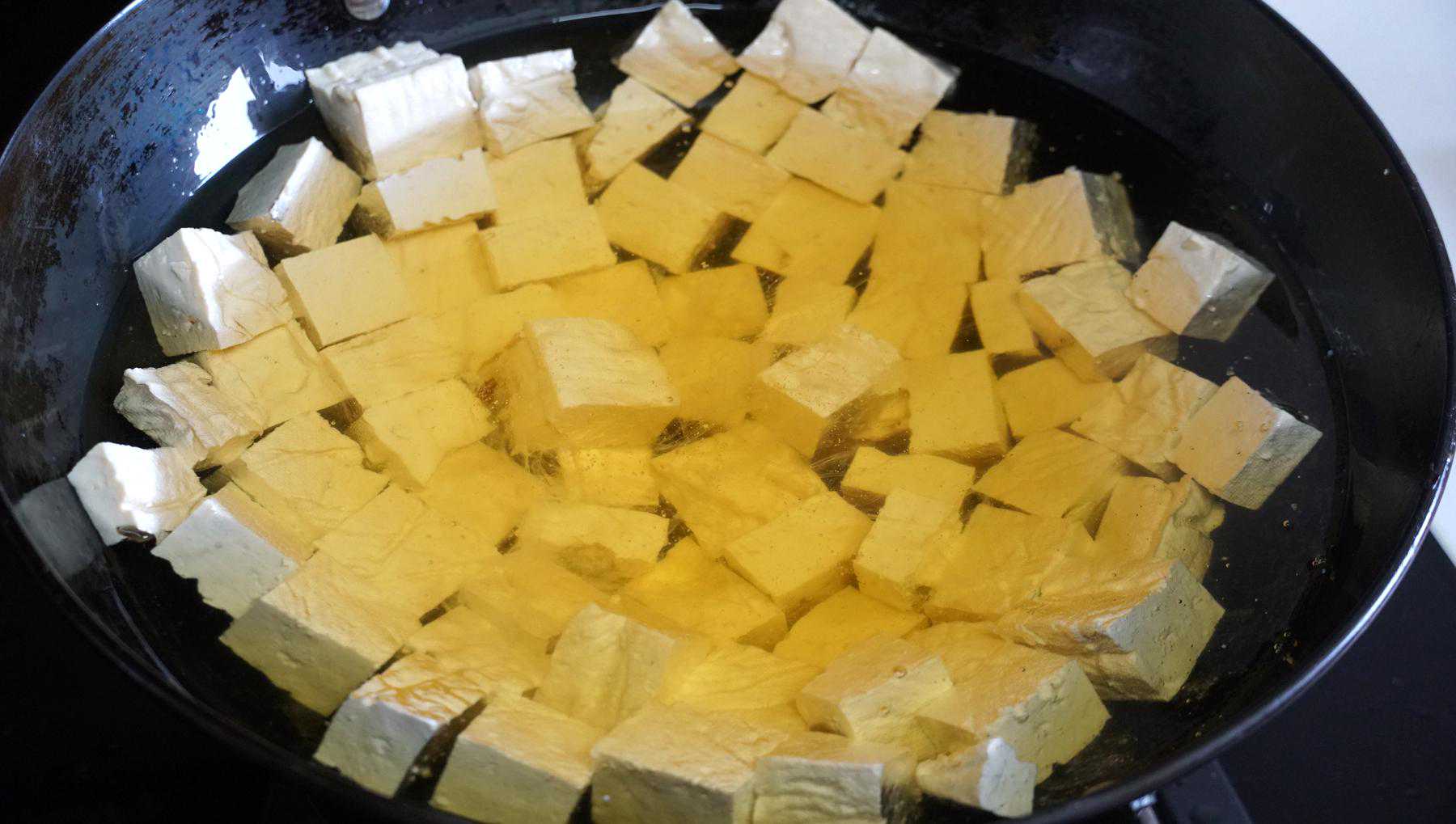 2、全部切好后起锅热油,炸这个豆泡要凉油放豆腐下去炸,大概3层油温就行,用小火去炸。