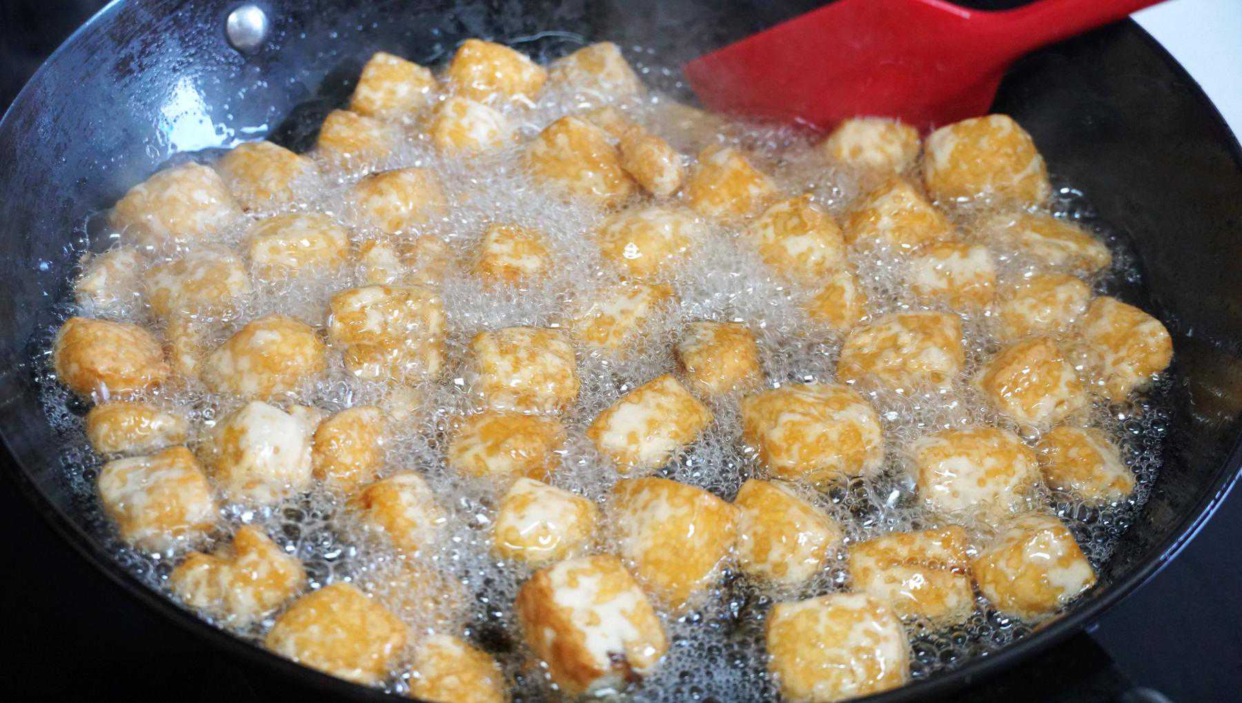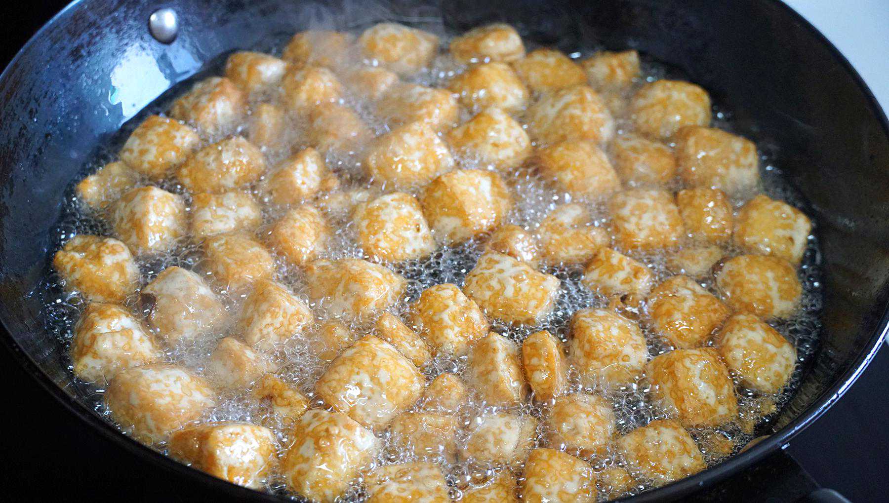 4、让每一块儿豆腐都能受热均匀,慢慢的,豆腐块就开始变得圆鼓鼓的了。