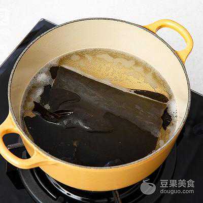 1、将昆布放入水中浸泡1个小时或者浸泡一晚。将昆布连同泡发昆布的水一起倒入锅中,慢煮约10分钟。沸腾前把昆布夹出来。