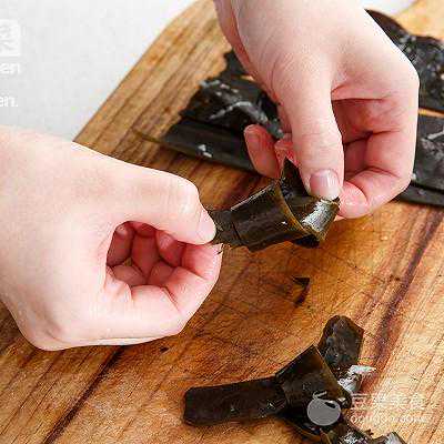 2、将煮好的昆布改刀成条,打成昆布结备用。