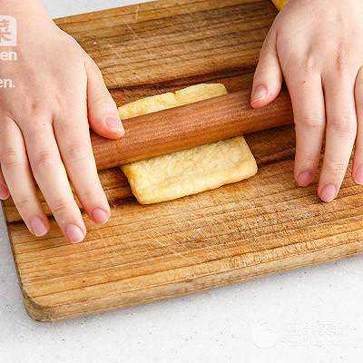 4、将油炸豆腐皮用擀面棍滚几下。