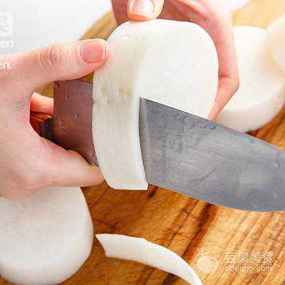 7、白萝卜处理方法:将白萝卜切厚段,将萝卜皮削厚一点,并将棱角削去,待锅中水沸腾后,煮15-20分钟,在放入冷水中浸泡。
