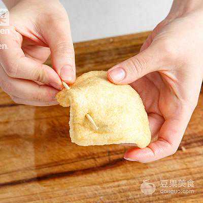 6、挤干油炸豆腐皮的水分,将油炸豆腐皮一边开一个口,将调味好的鸡肉糜放入油炸豆腐皮中,用牙签封口。