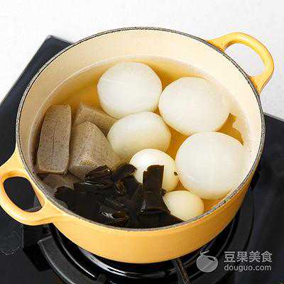 10、组合:将白萝卜,魔芋,白煮蛋、土豆、昆布结和底料一起放入锅中,加入又伊鲜鲜味酱油、味淋、糖,小火炖煮40分钟左右。
