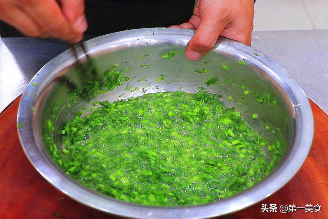 2.小茴香洗干净、切成碎粒,和鸡蛋液放在一起,继续搅匀。