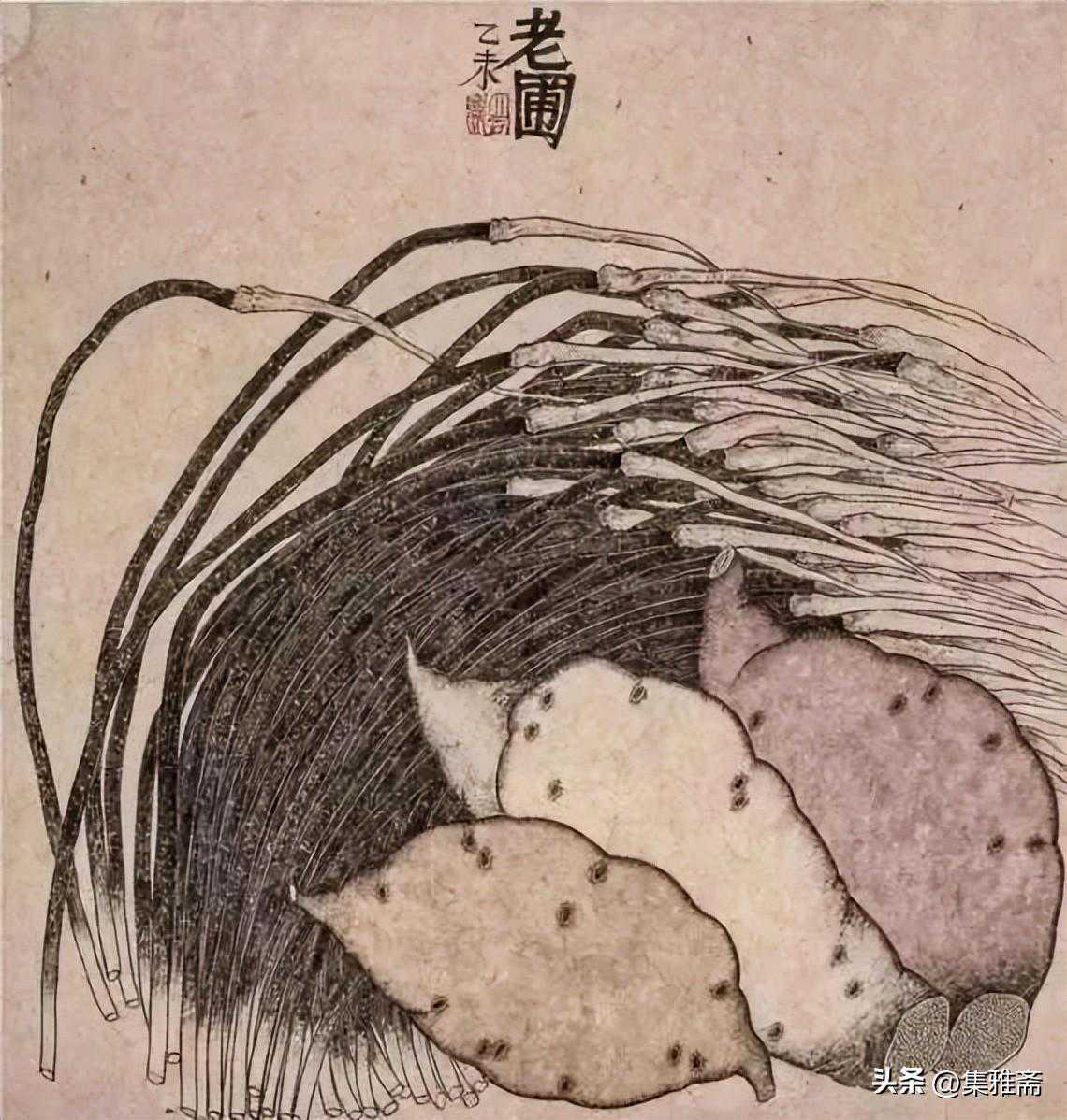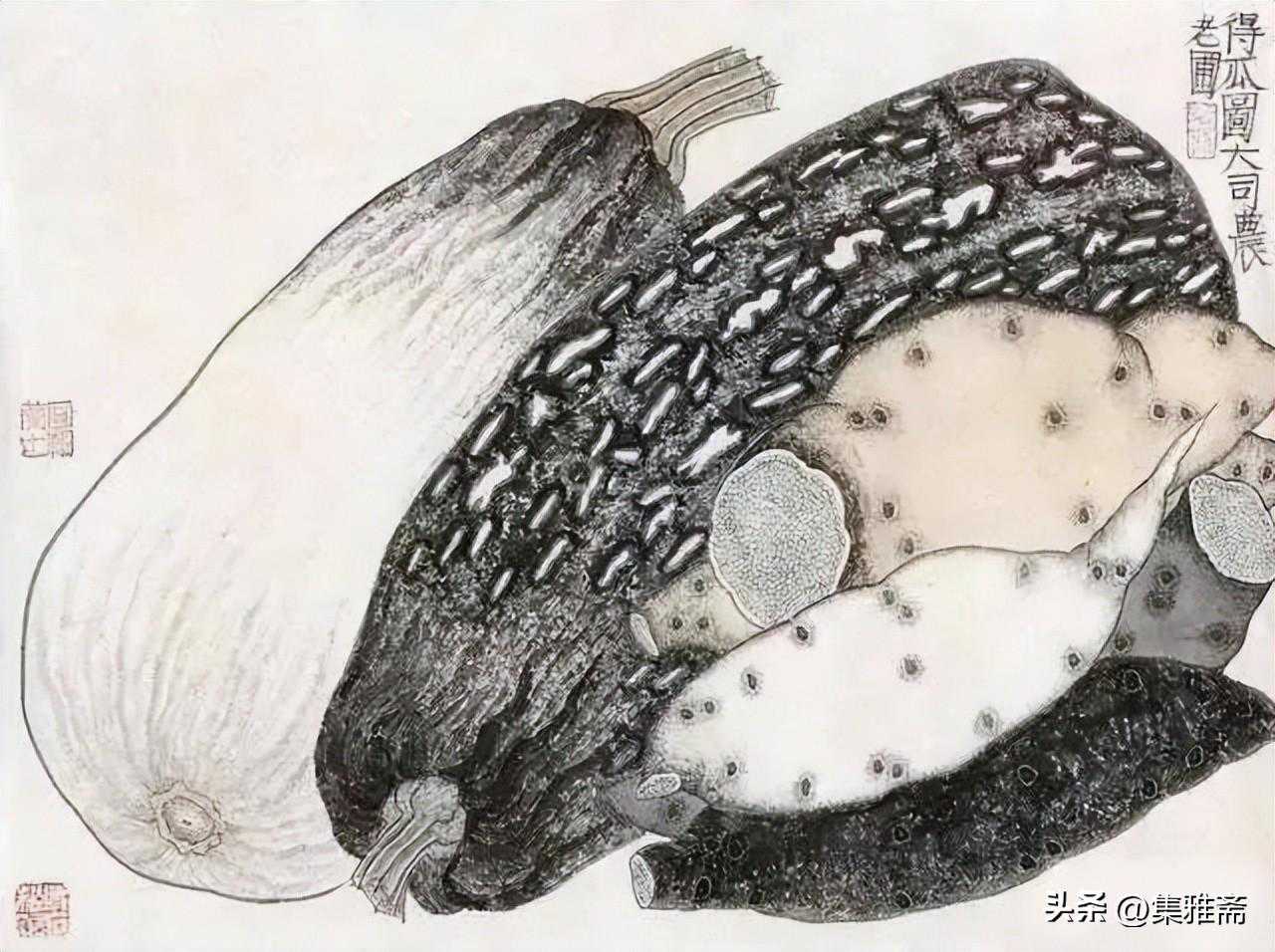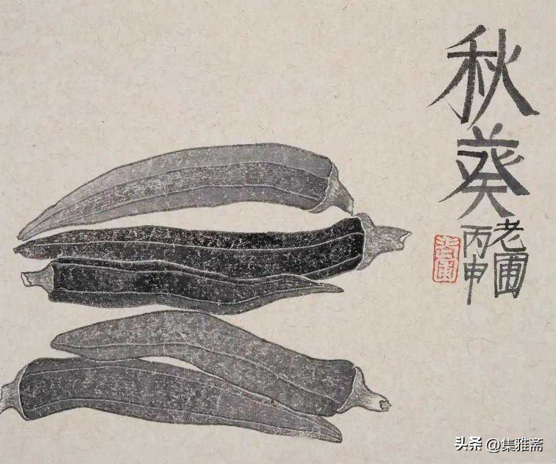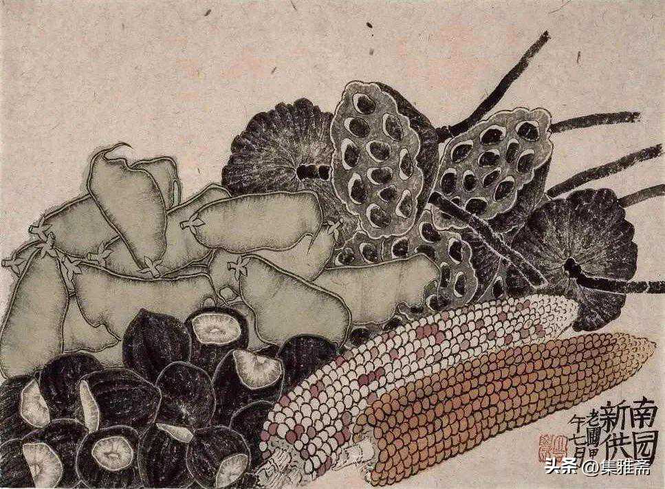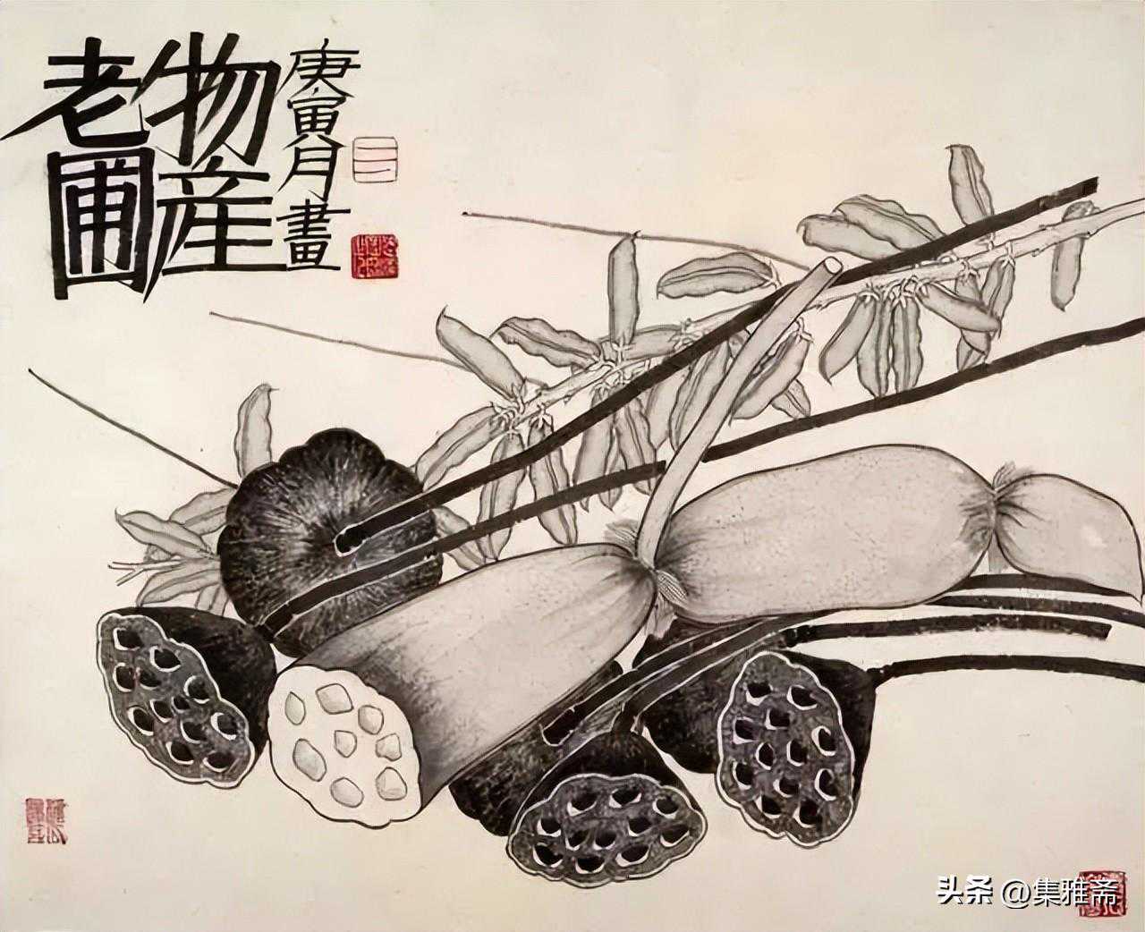 或墨线勾勒,或干笔皴擦,寥寥数笔,生动传神。老圃笔下的蔬果画,既有中国画的传统文脉,又有西方绘画技法的妙用。此外,他创新题款,使之有斧劈刀刻之感。萝卜、莲蓬以圆笔勾勒,题款以方笔仿宋印刷体点缀,方圆结合,逸趣横生。