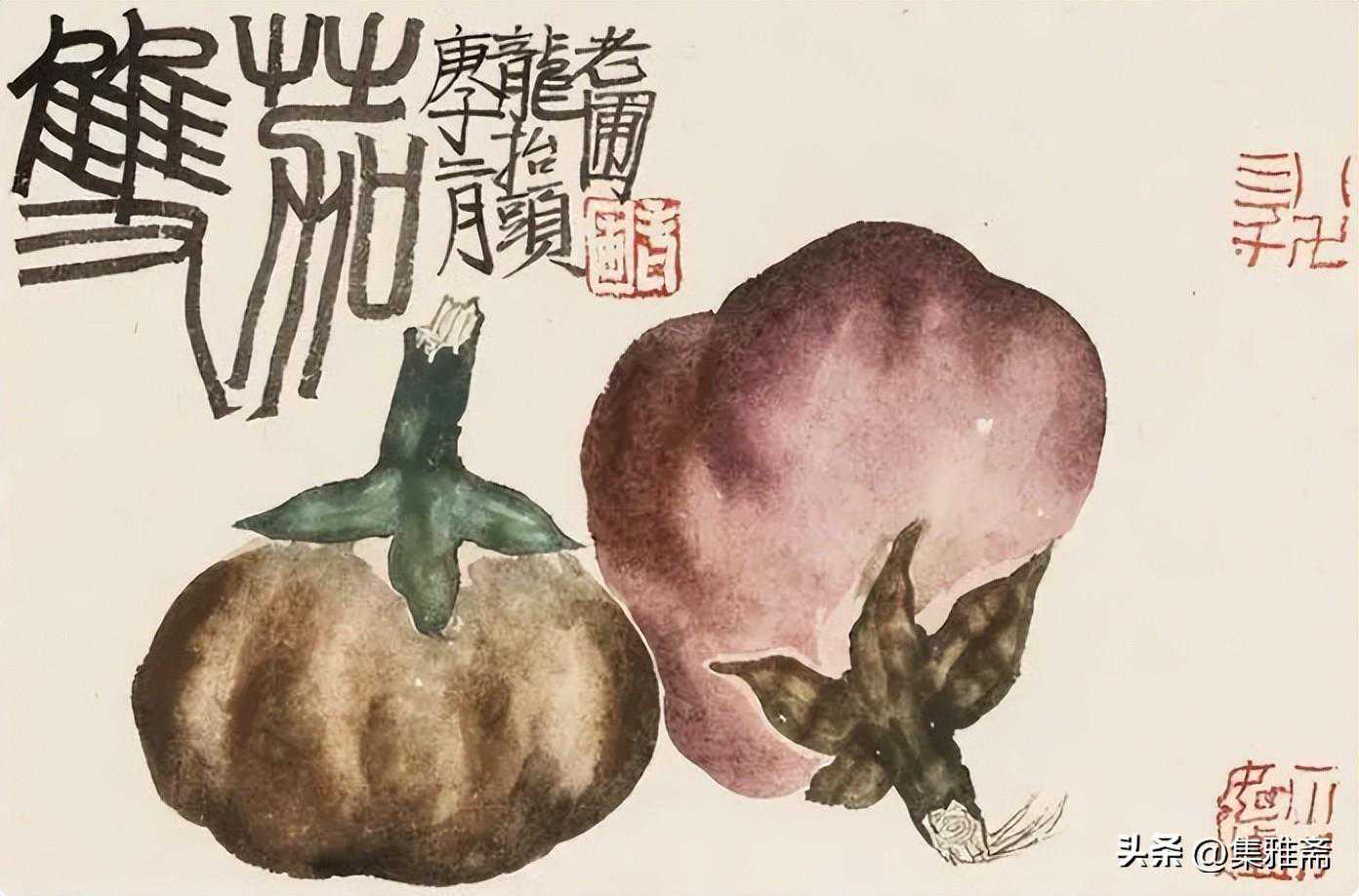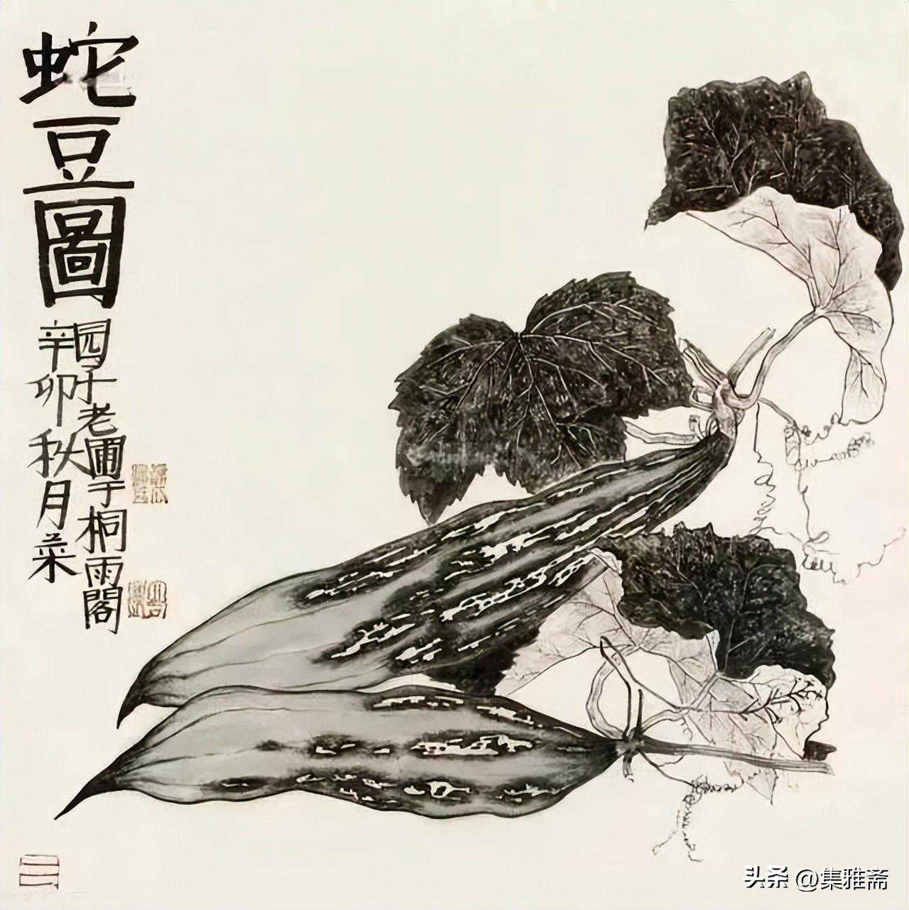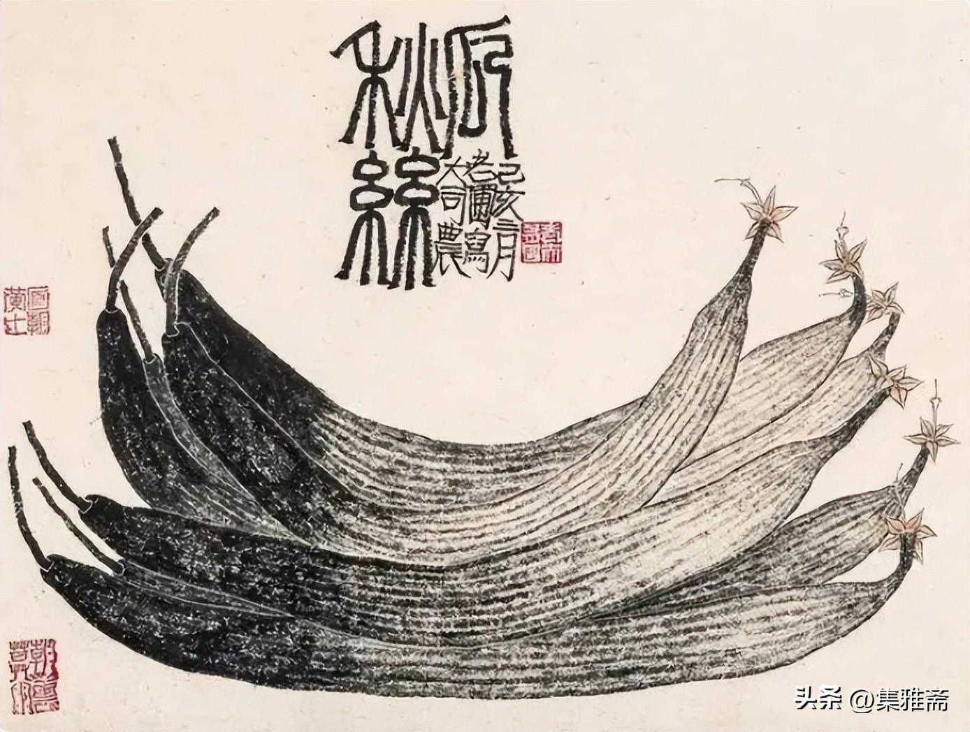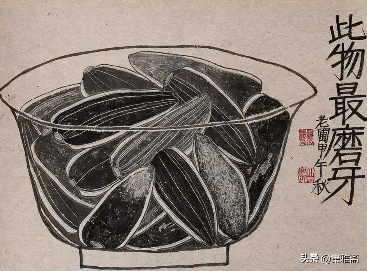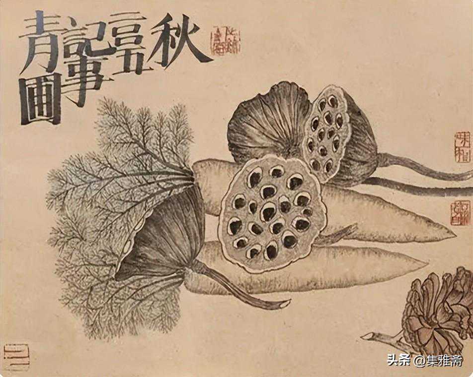 或墨线勾勒,或干笔皴擦,寥寥数笔,生动传神。老圃笔下的蔬果画,既有中国画的传统文脉,又有西方绘画技法的妙用。此外,他创新题款,使之有斧劈刀刻之感。萝卜、莲蓬以圆笔勾勒,题款以方笔仿宋印刷体点缀,方圆结合,逸趣横生。