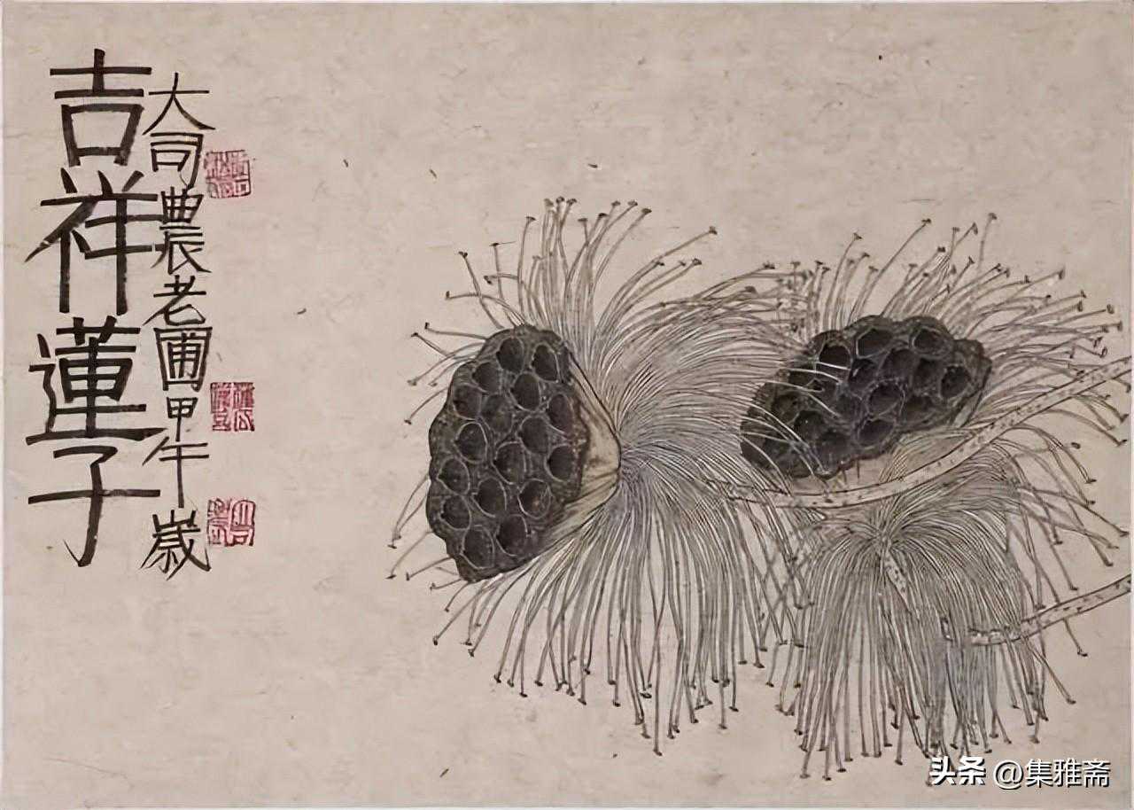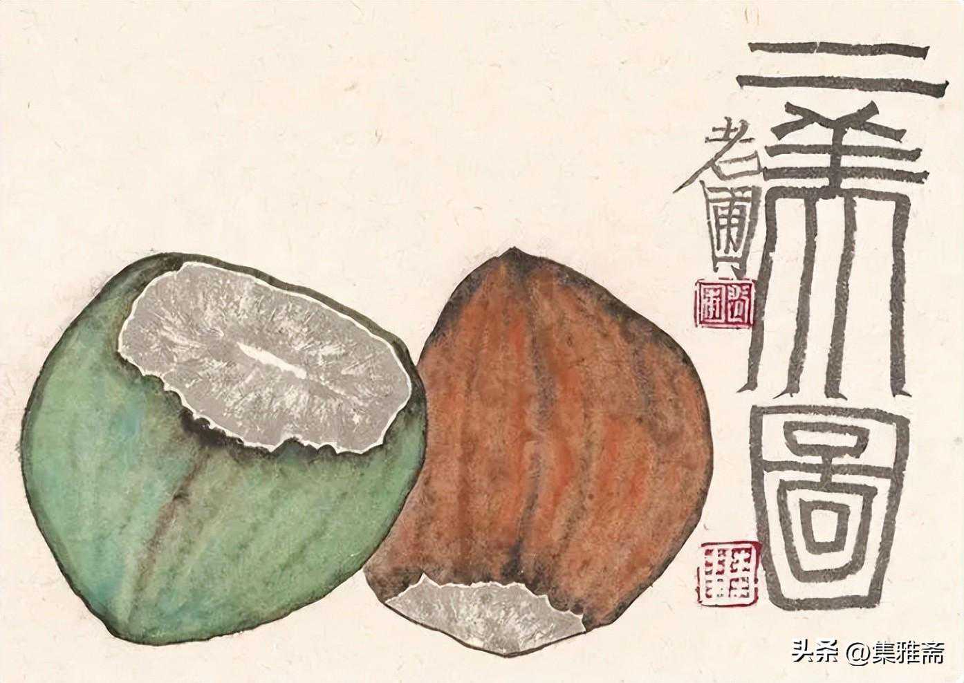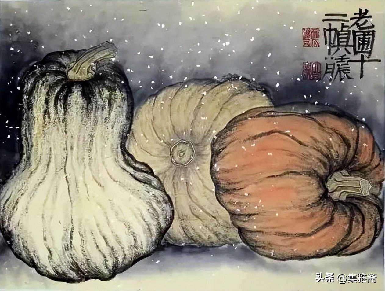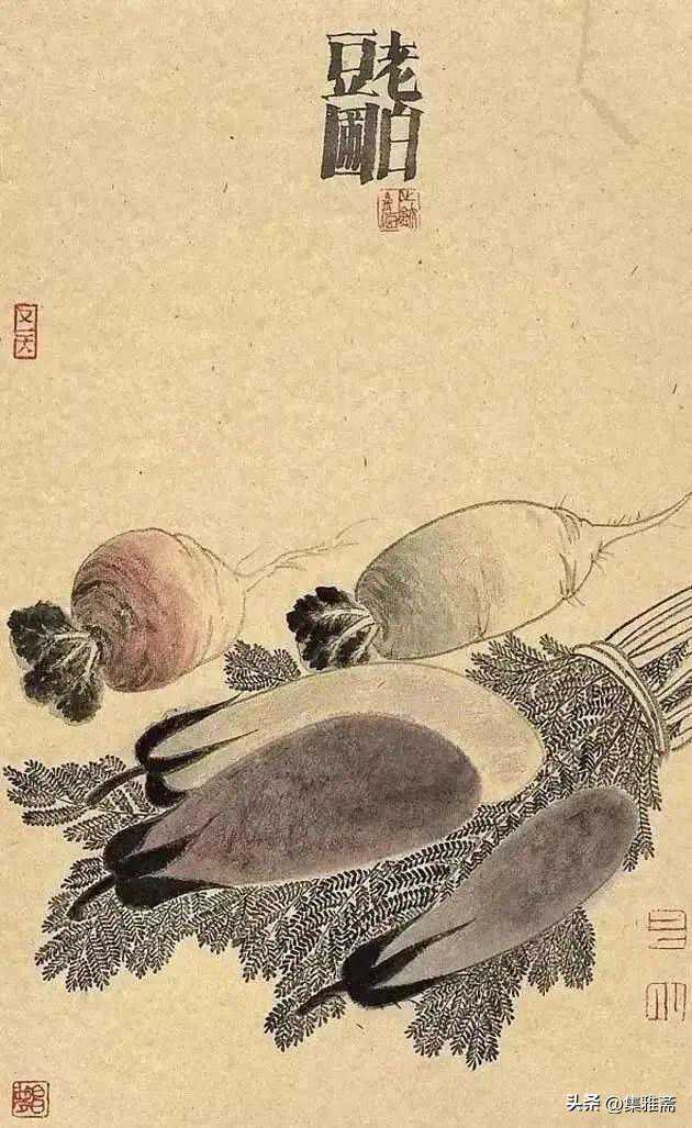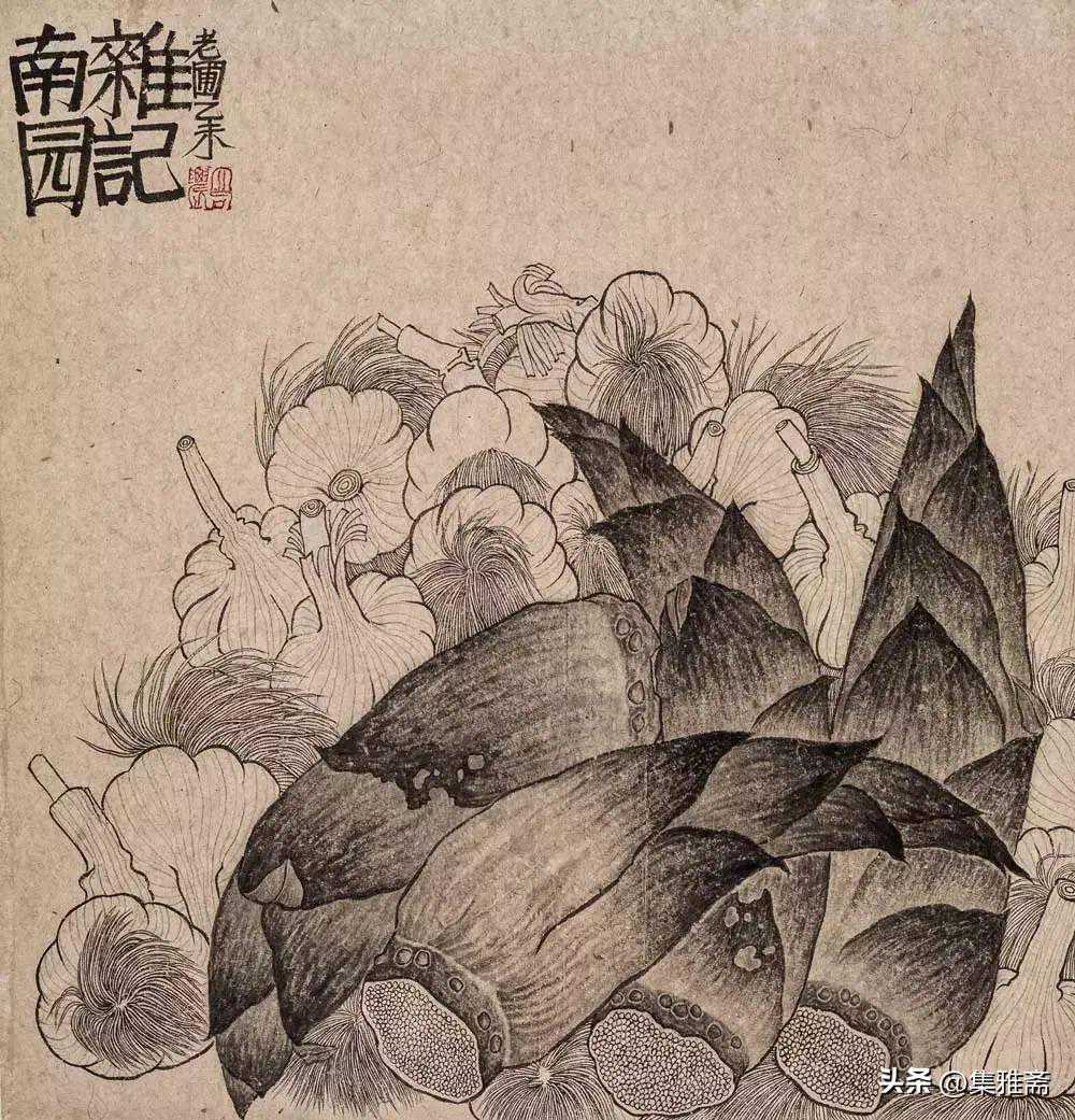 或墨线勾勒,或干笔皴擦,寥寥数笔,生动传神。老圃笔下的蔬果画,既有中国画的传统文脉,又有西方绘画技法的妙用。此外,他创新题款,使之有斧劈刀刻之感。萝卜、莲蓬以圆笔勾勒,题款以方笔仿宋印刷体点缀,方圆结合,逸趣横生。
