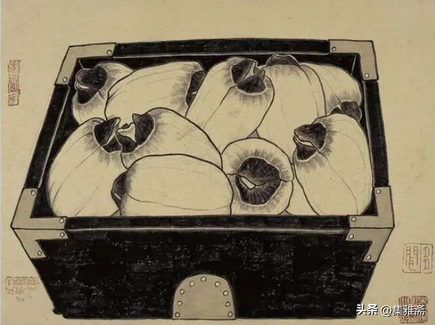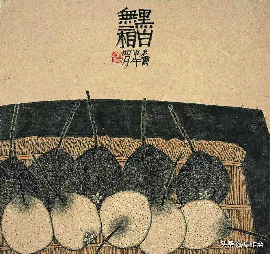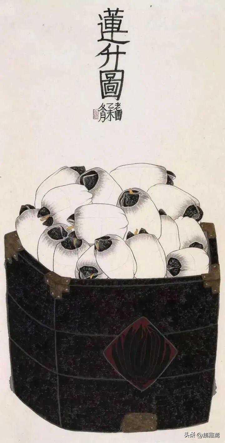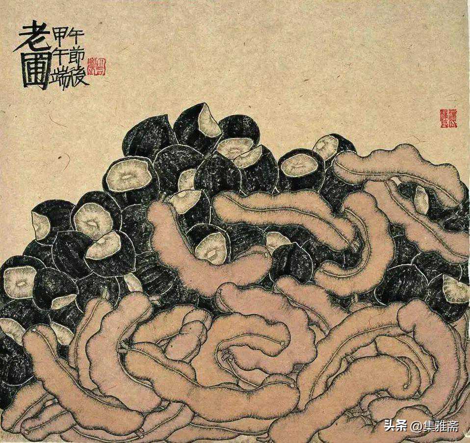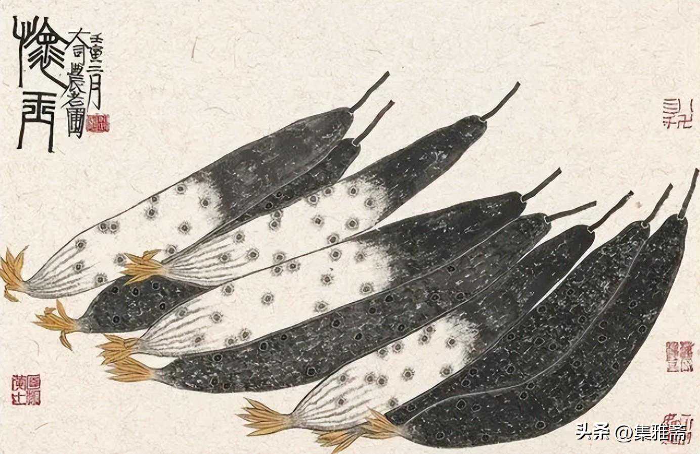 或墨线勾勒,或干笔皴擦,寥寥数笔,生动传神。老圃笔下的蔬果画,既有中国画的传统文脉,又有西方绘画技法的妙用。此外,他创新题款,使之有斧劈刀刻之感。萝卜、莲蓬以圆笔勾勒,题款以方笔仿宋印刷体点缀,方圆结合,逸趣横生。