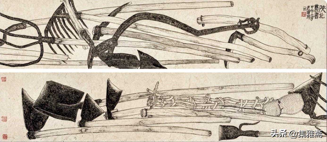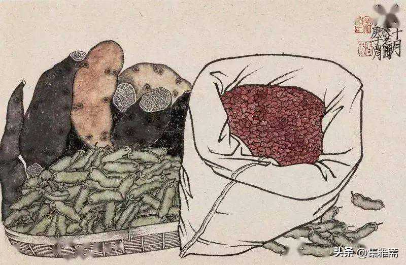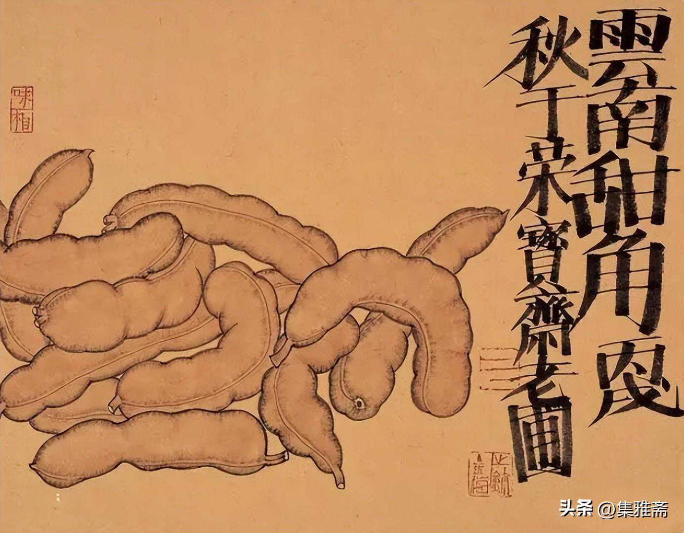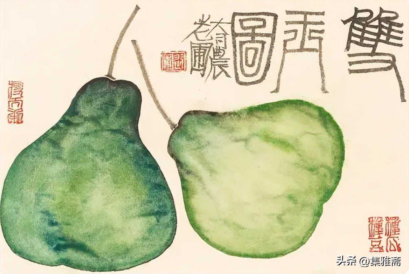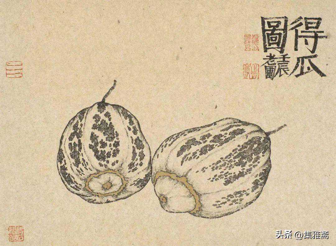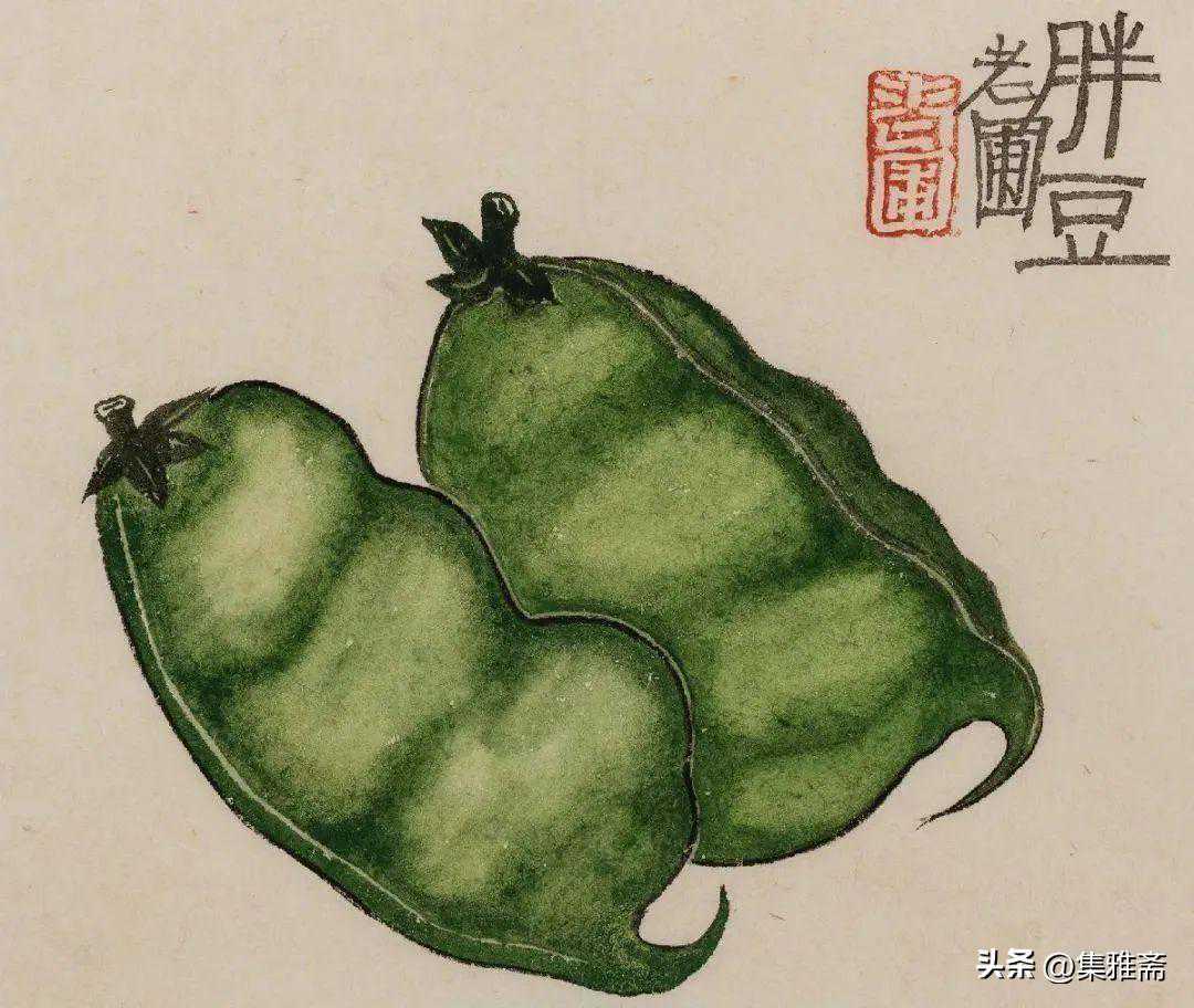 或墨线勾勒,或干笔皴擦,寥寥数笔,生动传神。老圃笔下的蔬果画,既有中国画的传统文脉,又有西方绘画技法的妙用。此外,他创新题款,使之有斧劈刀刻之感。萝卜、莲蓬以圆笔勾勒,题款以方笔仿宋印刷体点缀,方圆结合,逸趣横生。