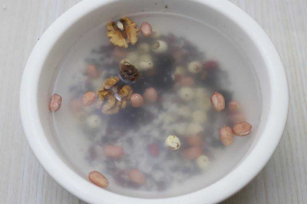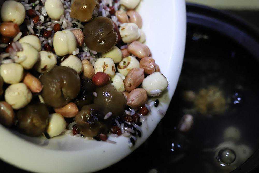 用料:大米一把,糯米一把,紫米一把,红小豆一把,莲子一把,花生米一把,核桃一个,桂圆干几颗,冰糖适量