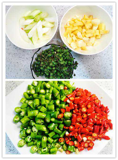 辅料:二荆条辣椒100克红小米辣50克大葱一根青花椒20克大蒜15克姜15克
