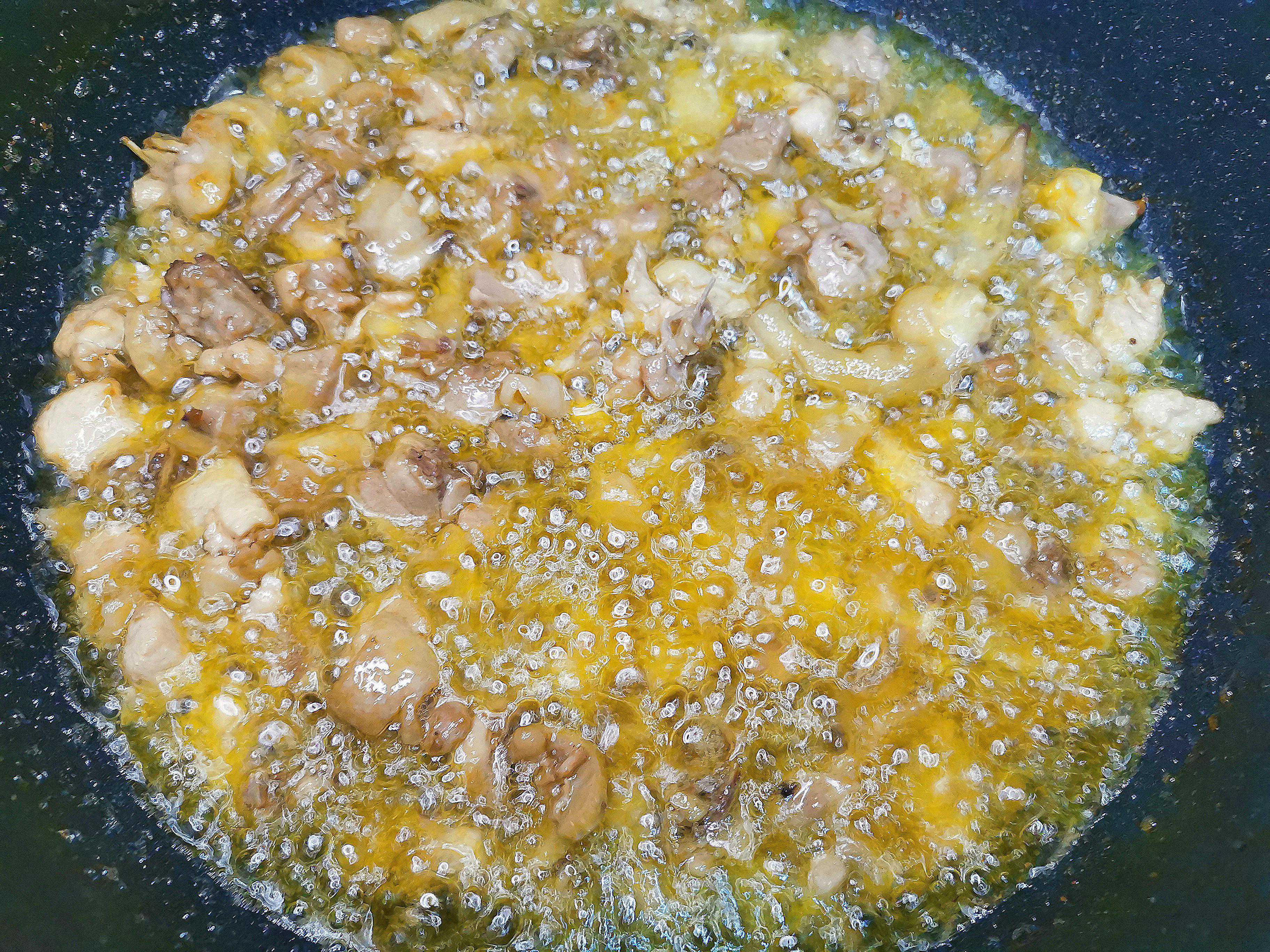 4.油温6成热,倒入鸡丁过油,炸至鸡肉表面微黄即可捞出。