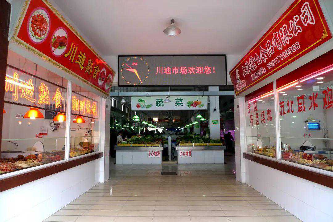 位于川环南路401号,经营面积2400平方米,各类摊位108个,主副食用产品供应丰富,食品安全信息追溯系统完备。2019年,市场在多方支持下将场内一处位置优良的内圈房改建成了“职工书屋”和“妇女之家”,在菜场里搭建出一个良好的文化与交流平台。