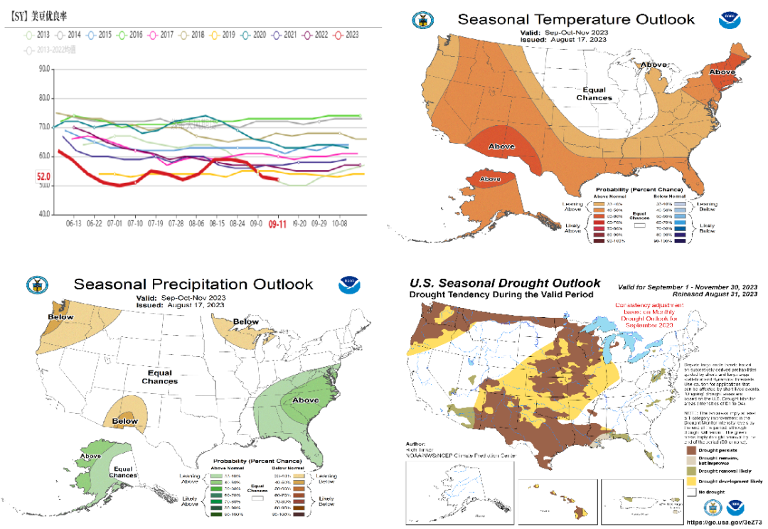 优良率:低位且一路下滑,截至9月11日当周,美豆优良率进一步下滑1个百分点至52%。过去4年均值为58.25%。