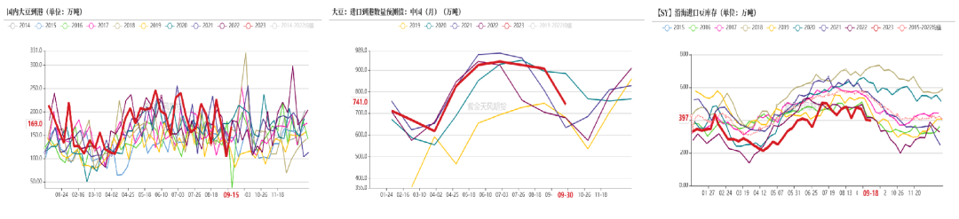 大豆到港量:国内123家油厂8月实际到港量941.5万吨,7月实际到港量890.1万吨,6月实际到港量936万吨。初步预估国内123家主要油厂9月到港741万吨,10月600万吨,11月880万吨。10月前大豆整体能满足市场需求,但10月后采购少,到港或进一步趋紧。