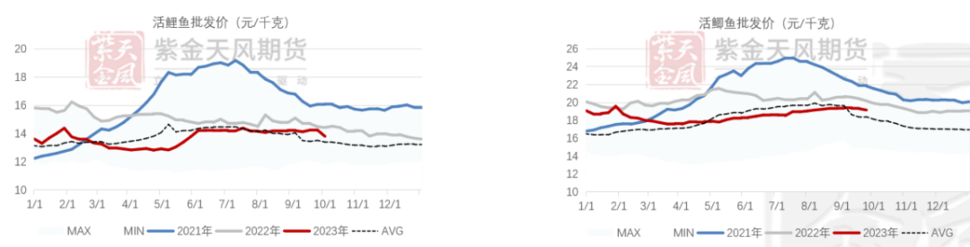 活鲤鱼:7、8、9月均价分别为14.22、14.17、14.21元/千克,历史五年均值分别是14.33、14.05、13.63元/千克。