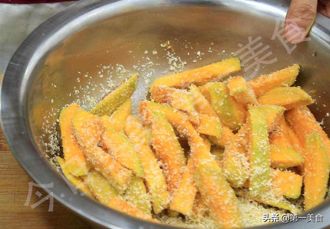 准备板栗小南瓜一个,把外皮削掉,先切成厚片再切成南瓜条放入盆中,加入白糖10克用手抓匀,淋入植物油5克,植物油能在南瓜条表面形成油膜,防止其大量出水,再倒入适量的椰蓉颠盆拌匀,让南瓜条均匀裹上椰蓉备用。