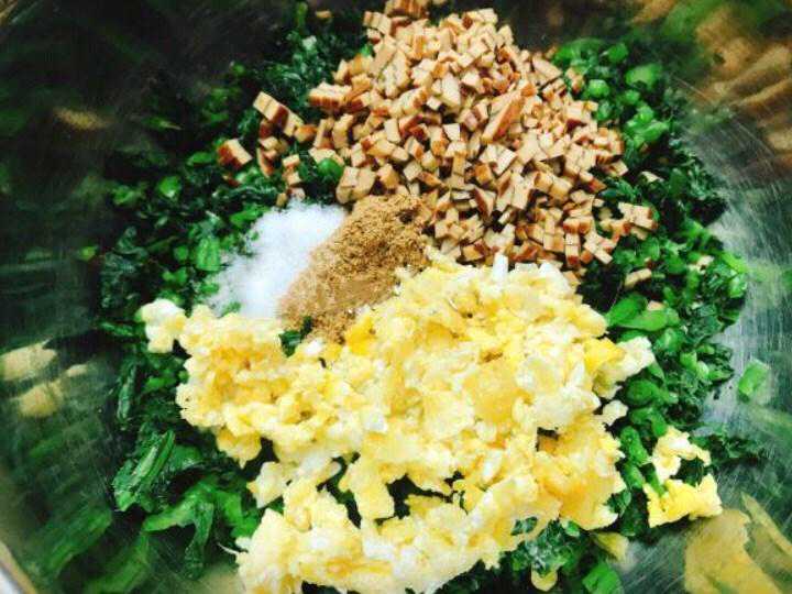 1.苋菜洗净,焯水切碎,鸡蛋焯熟切碎,五香豆干切碎