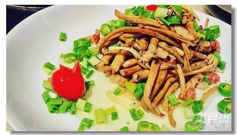放盐、淋料酒、倒入小葱颗和二筋条颗及小米辣切颗炒匀即可;