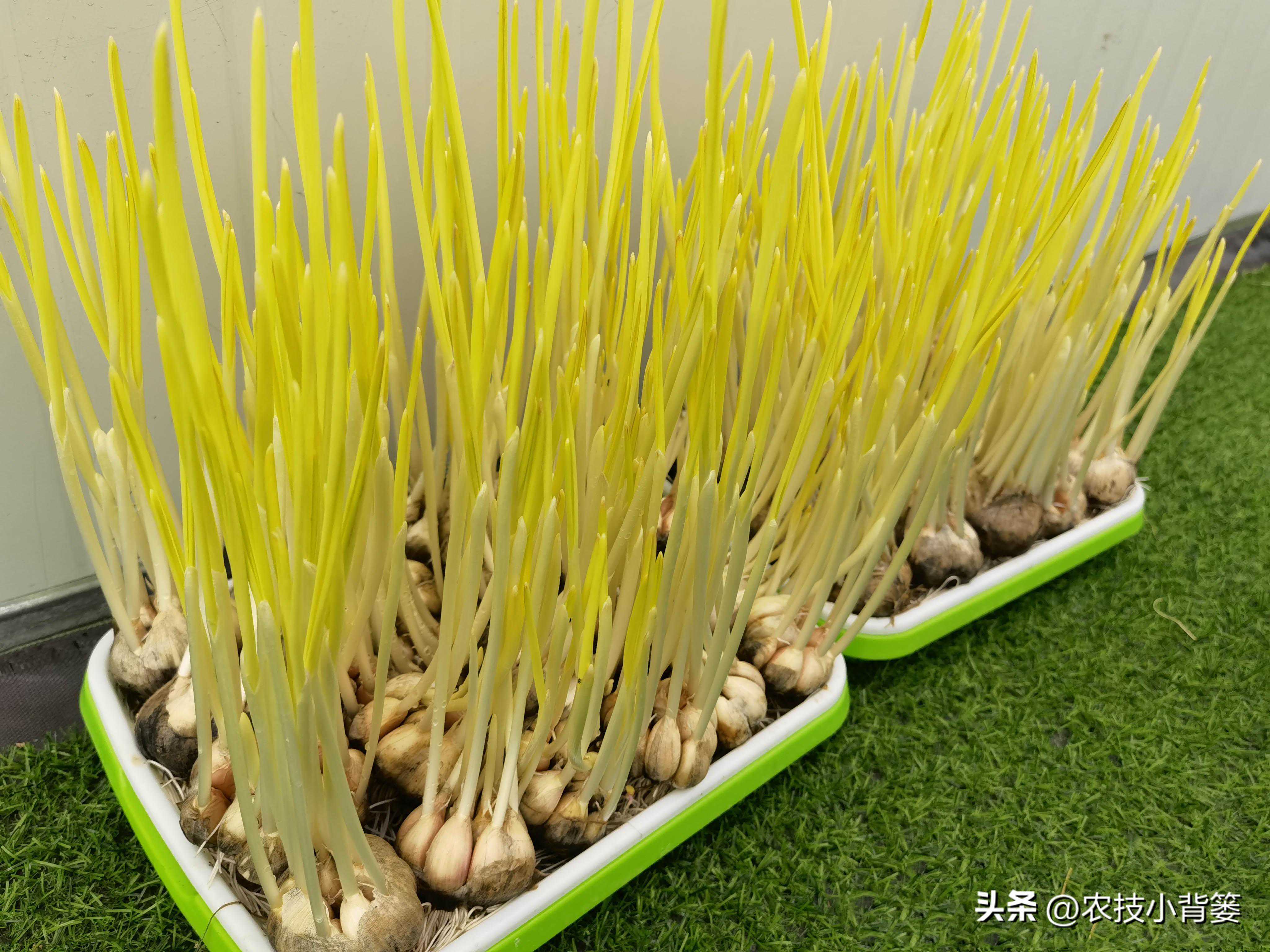 种植蒜苗和蒜黄的方法也比较简单,大家既可以直接把小蒜苗的根部栽种在湿润土壤里让它生长,也可以直接用蒜瓣儿(蒜瓣尖向上)栽种在湿润土壤里让它生长。如果你嫌种大蒜比较麻烦,也可以直接把它栽种在小浅水盆里(水培大蒜),然后将其端到阳台上让它自然生长即可。