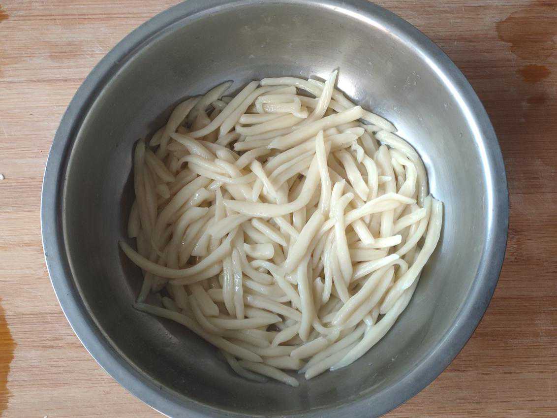 锅里加上水烧开改小火一直烧着,拿剪刀顺着面块剪刀锅里,至于面的大小要看您拿的剪刀多大,不需要在意。前面之所以把面团做成饼是为了更方便操作,毕竟做剪刀面是个熟能生巧的活,所以刚刚开始做还是用最直接的方式比较容易。把面煮好以后捞到出来,可以看出面的样子像银针一样。