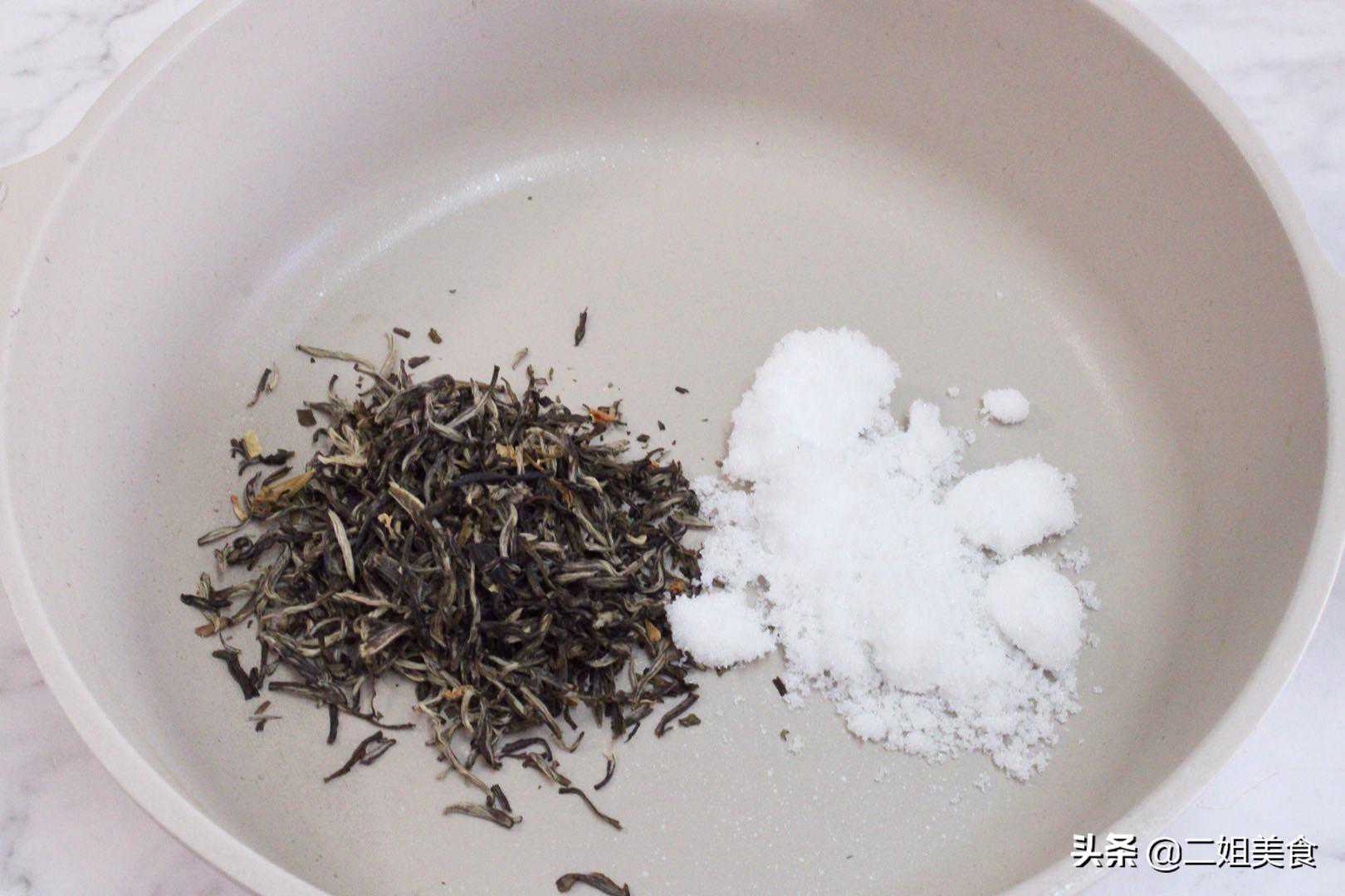 3、继续翻炒,我们可以看到锅中的糖已经融化了,而且白糖和茶叶已经充分融合在一起了。