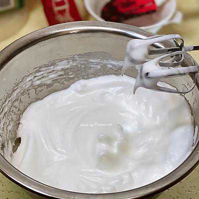 6、蛋白分三次加入细砂糖,打至蛋白提起弯勾的中性状态即可;