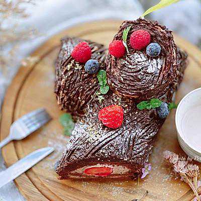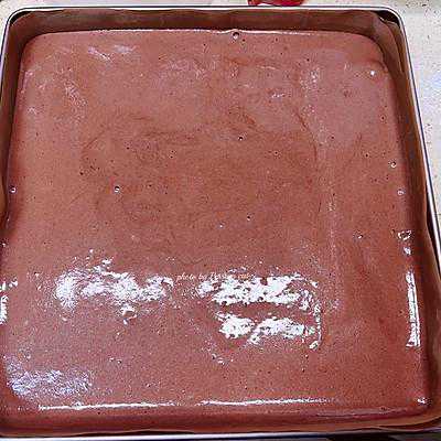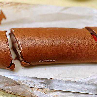 14、然后涂抹巧克力奶油,中间夹上草莓,用擀面杖辅助卷起,放冰箱定型1小时;这个步骤忘记拍照,可以参考之前蛋糕卷涂抹夹馅菜谱;