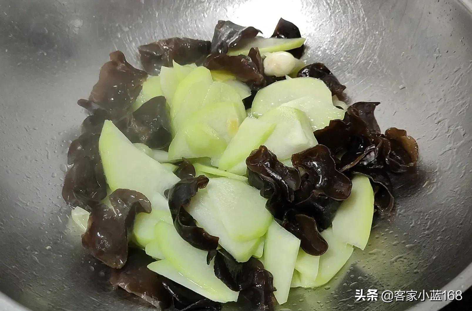 接着,再往锅里倒入适量油,下入姜片和葱头煸一下,倒入佛手瓜片,炒上一分钟,去一去佛手瓜的寒性,再倒入泡发洗净的木耳继续翻炒均匀。