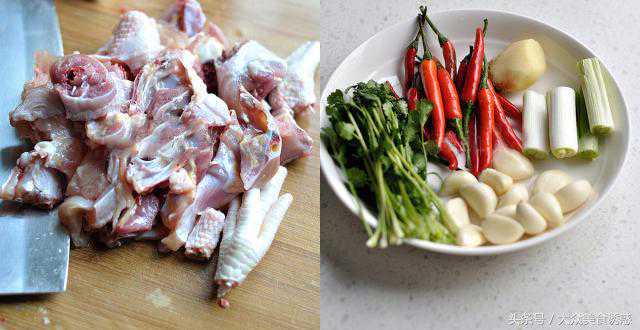1、这里用的是散养的小鸡,洗净后剁成小块,因为是用来干煸,因此剁的块一定要小一些,才更加容易入味;辅料择静;