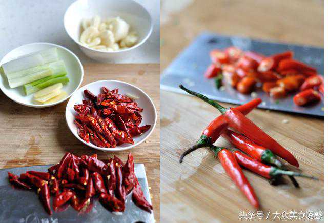 3、干红辣椒洗净后用清水浸泡后切大段,生姜切片;蒜瓣去皮后用刀拍扁;新鲜红尖椒洗净后切小款;